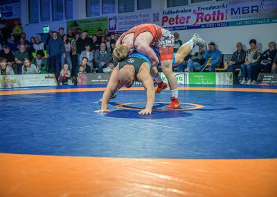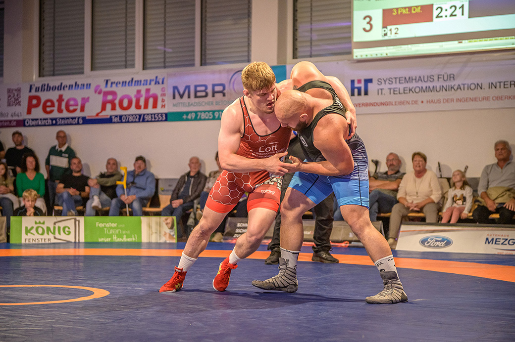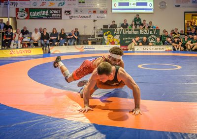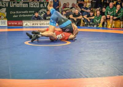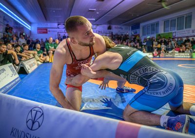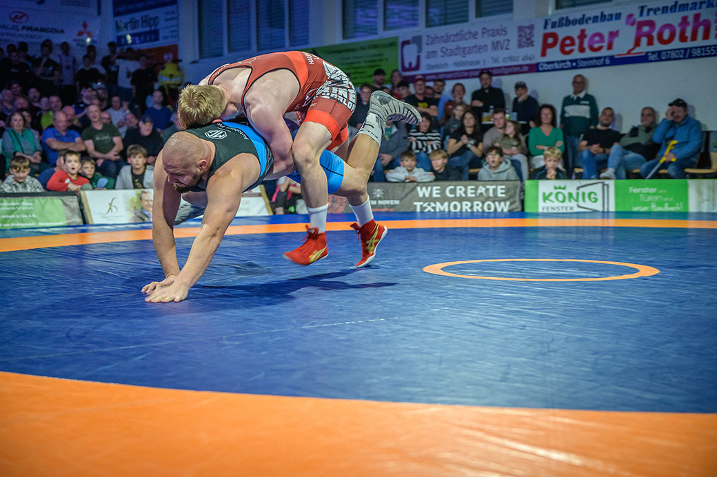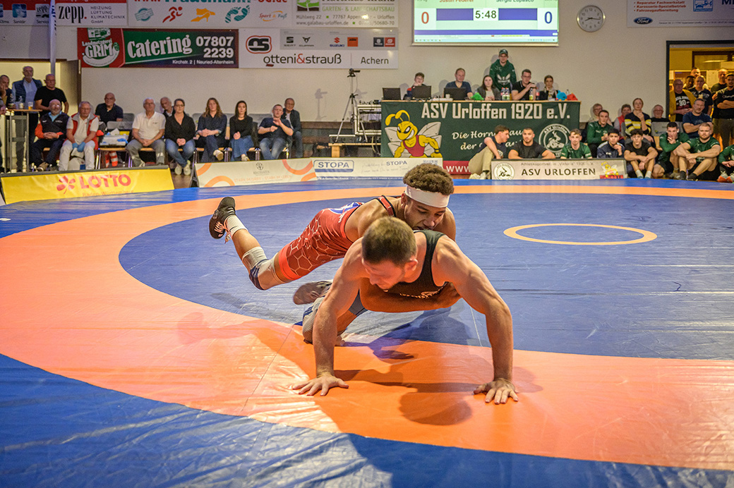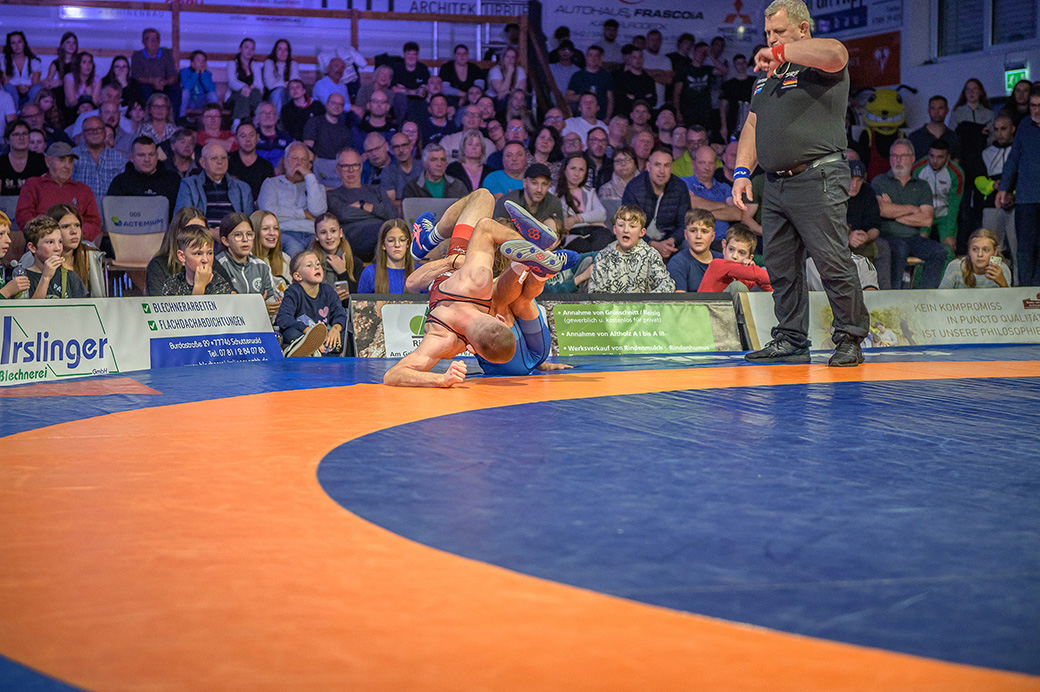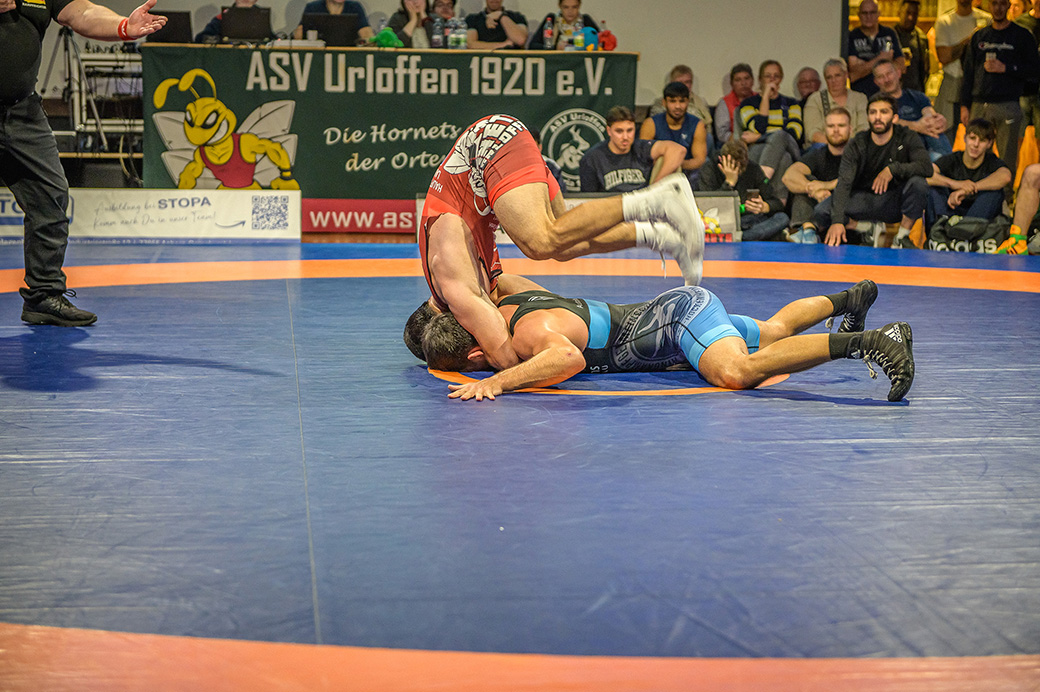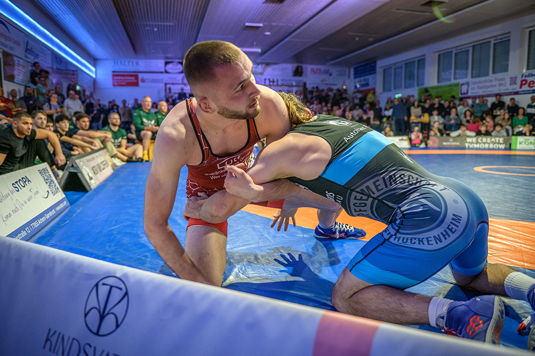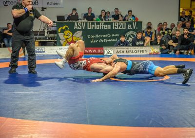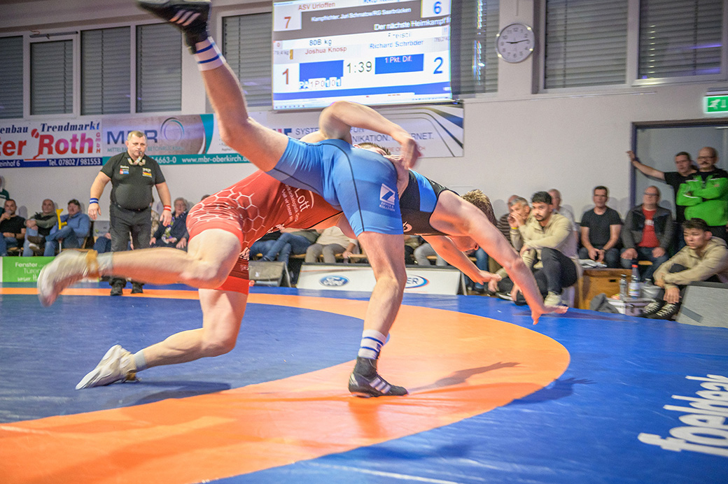 Einen hektischen Kampf bekamen die Fans hier geboten. Mit Joshua Knosp und Richard Schröder standen sich zwei Ringer gegenüber, welche sich auf der Matte nichts schenkten. Während Knosp versuchte seinen Gegner in Bedrängnis zu bringen, versuchte Schröder gezielt zu kontern. Immer wieder beklagte sich der Reilinger über die Ringweise des Hornets. Dies beantwortete Knosp mit einer schönen Aktion, die ihm zwei technische Punkte einbrachte. Nach sechs Minuten stand es 4:2 für den Hornet, und damit 8:6 für Urloffen.