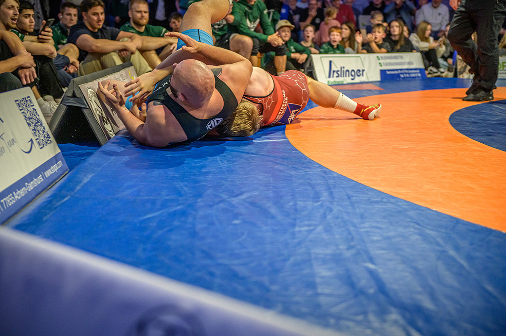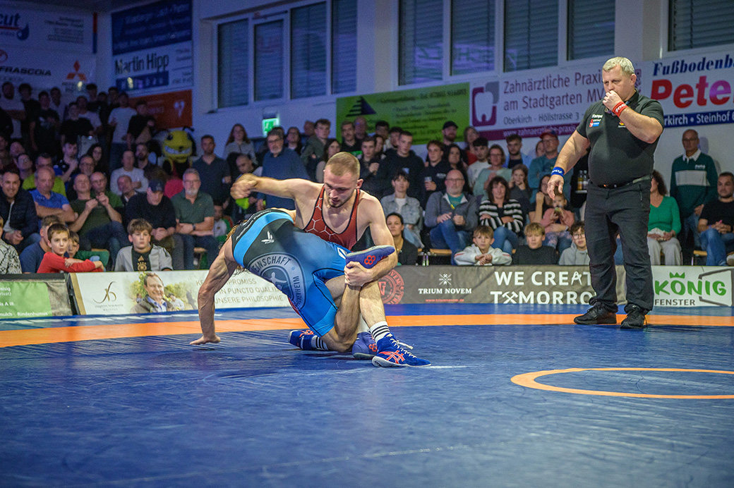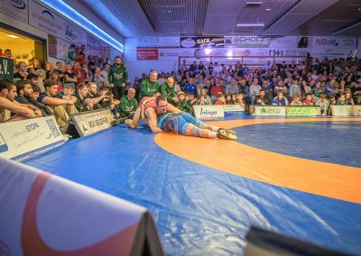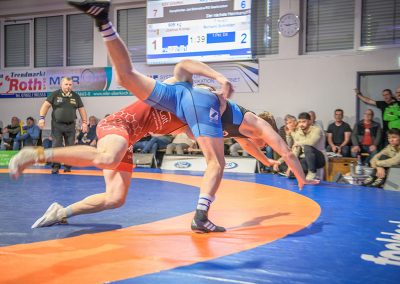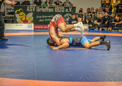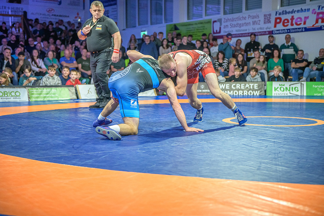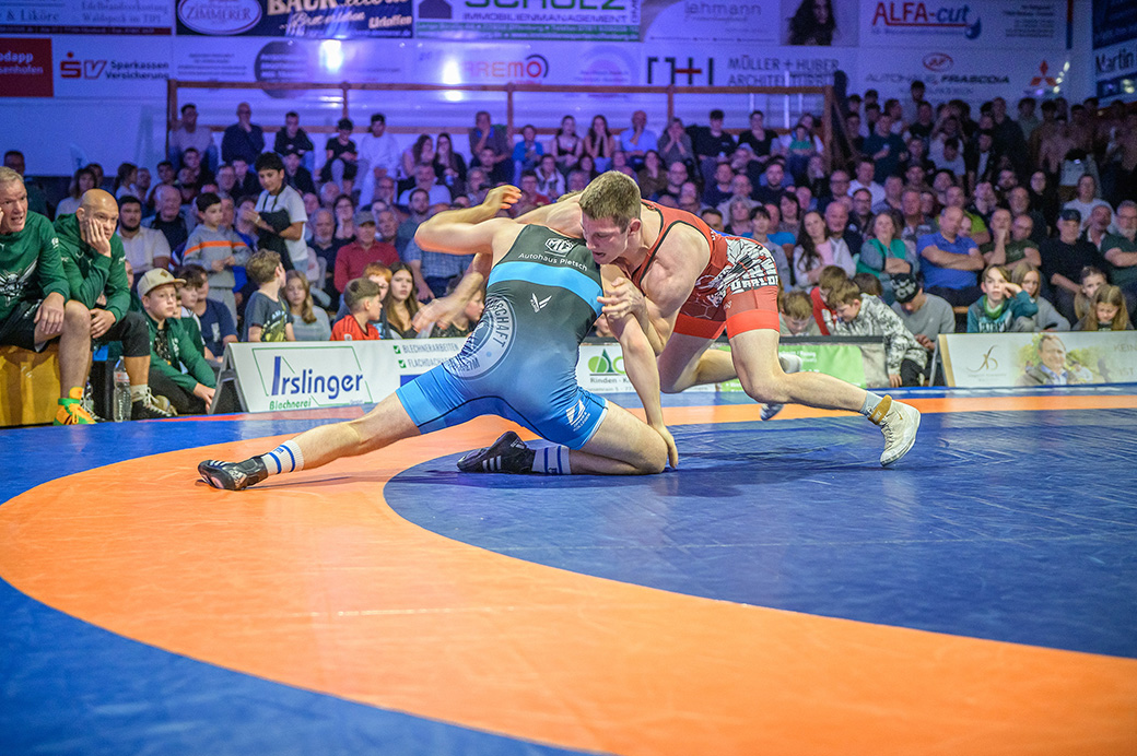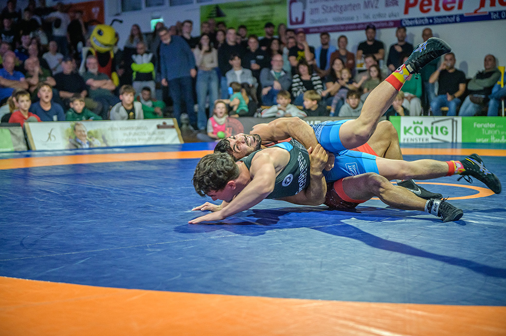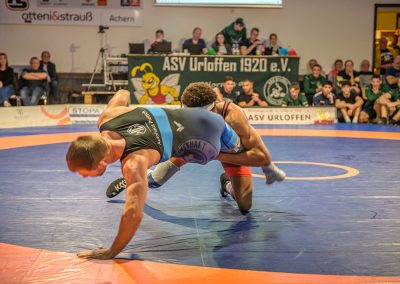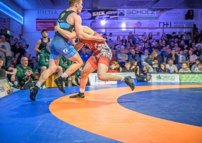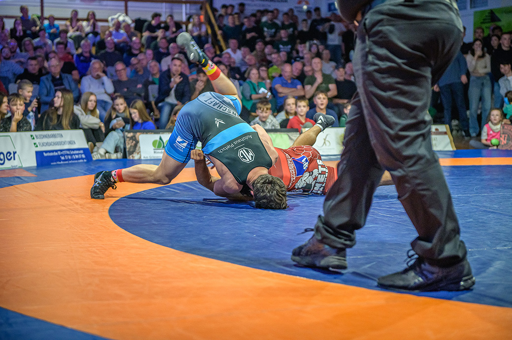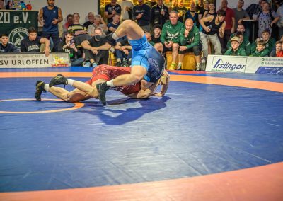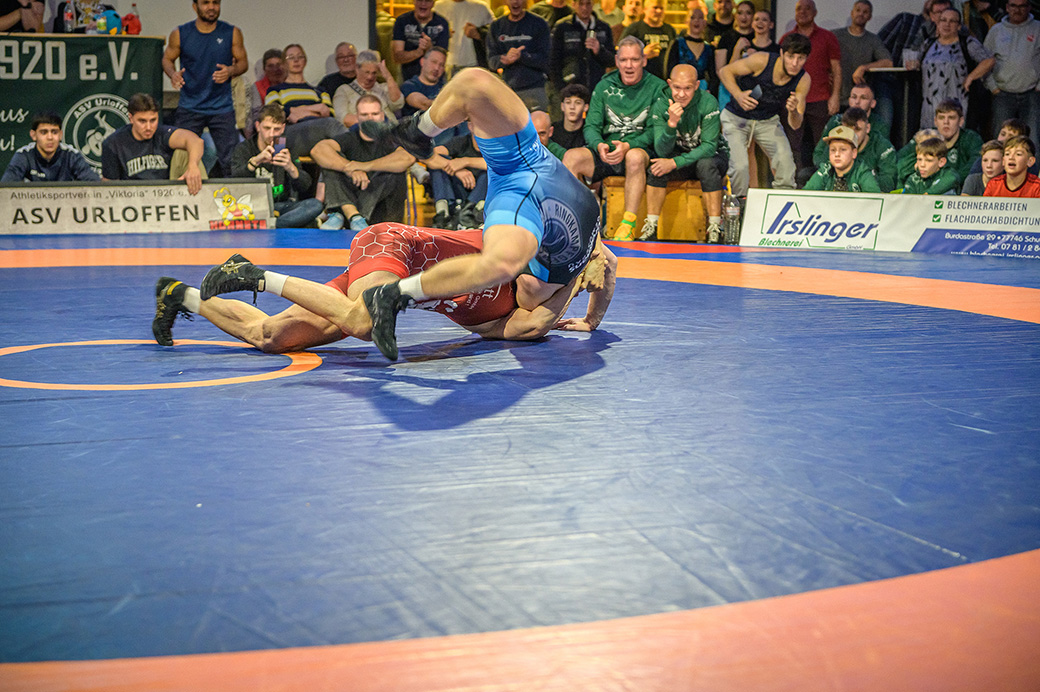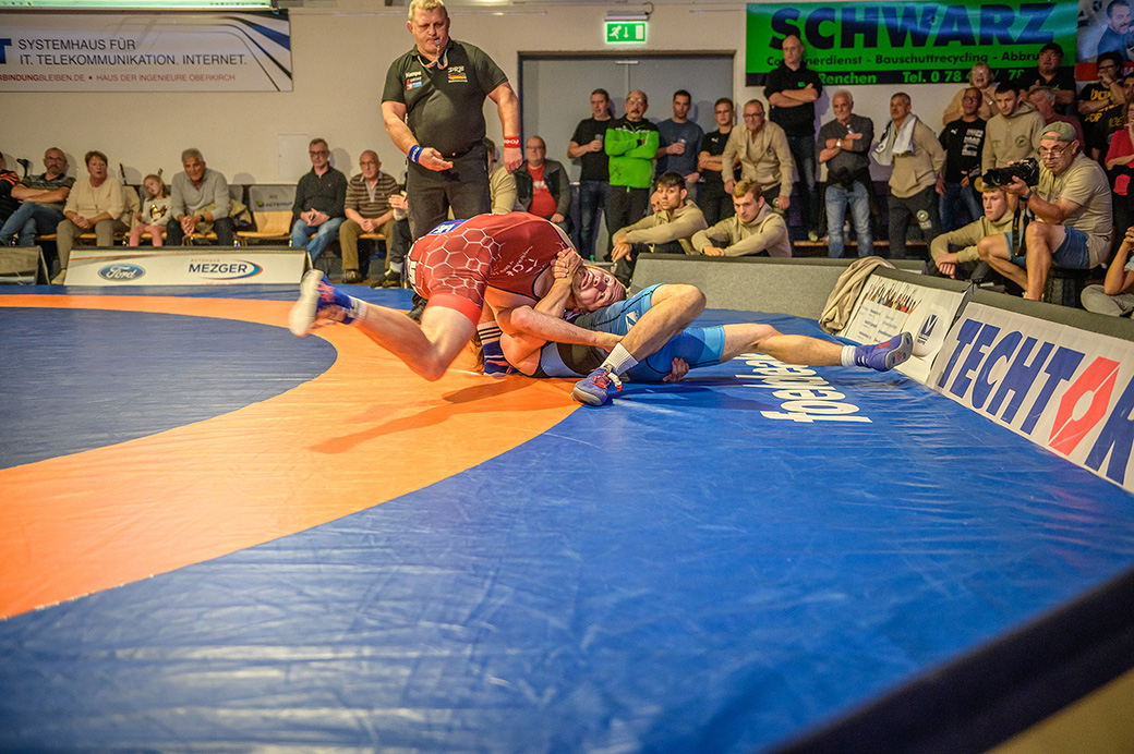 Einen hektischen Kampf bekamen die Fans hier geboten. Mit Joshua Knosp und Richard Schröder standen sich zwei Ringer gegenüber, welche sich auf der Matte nichts schenkten. Während Knosp versuchte seinen Gegner in Bedrängnis zu bringen, versuchte Schröder gezielt zu kontern. Immer wieder beklagte sich der Reilinger über die Ringweise des Hornets. Dies beantwortete Knosp mit einer schönen Aktion, die ihm zwei technische Punkte einbrachte. Nach sechs Minuten stand es 4:2 für den Hornet, und damit 8:6 für Urloffen.