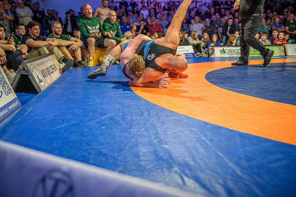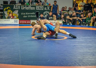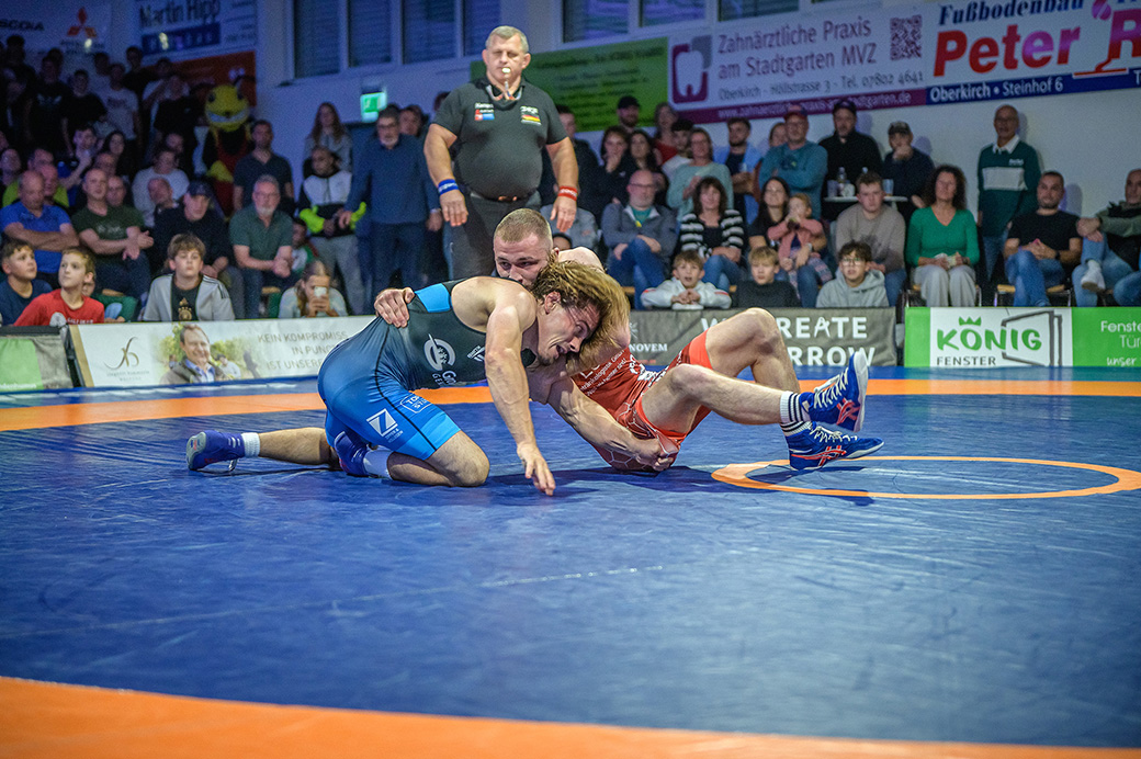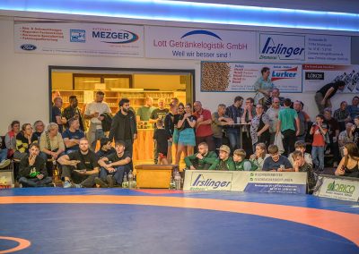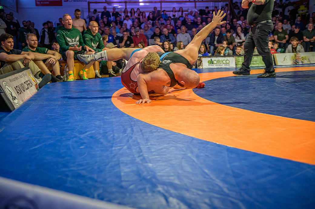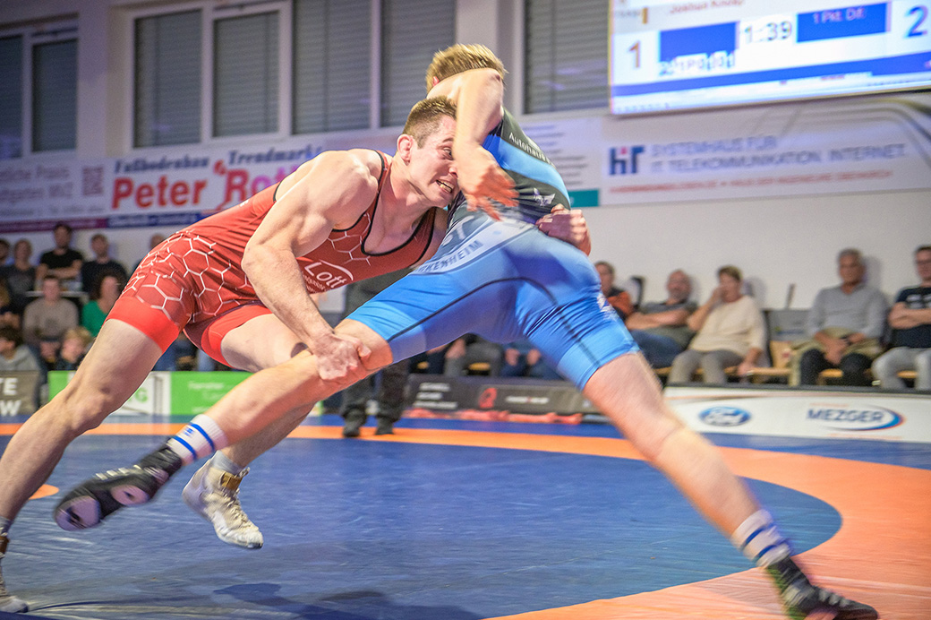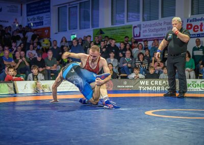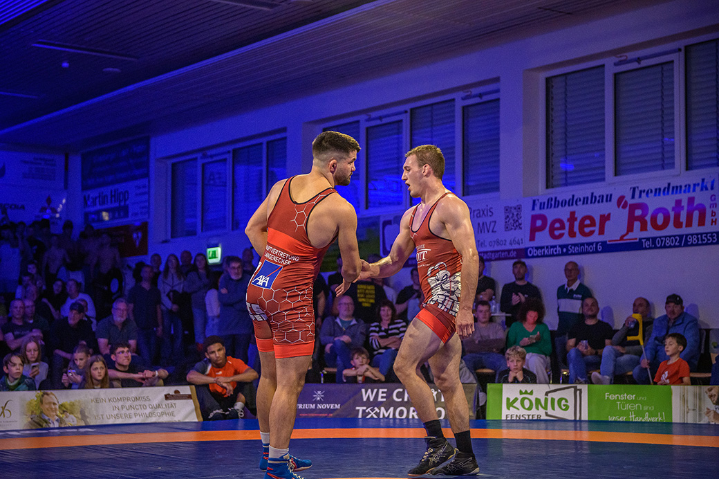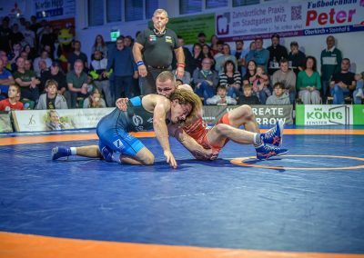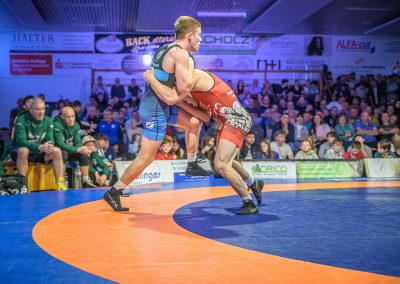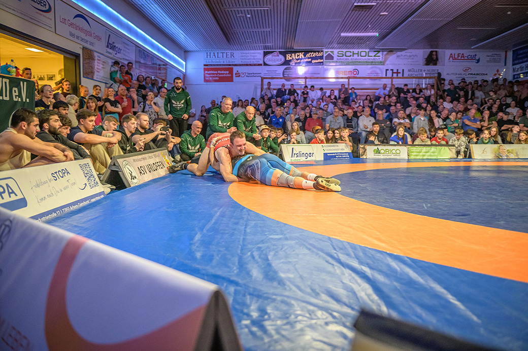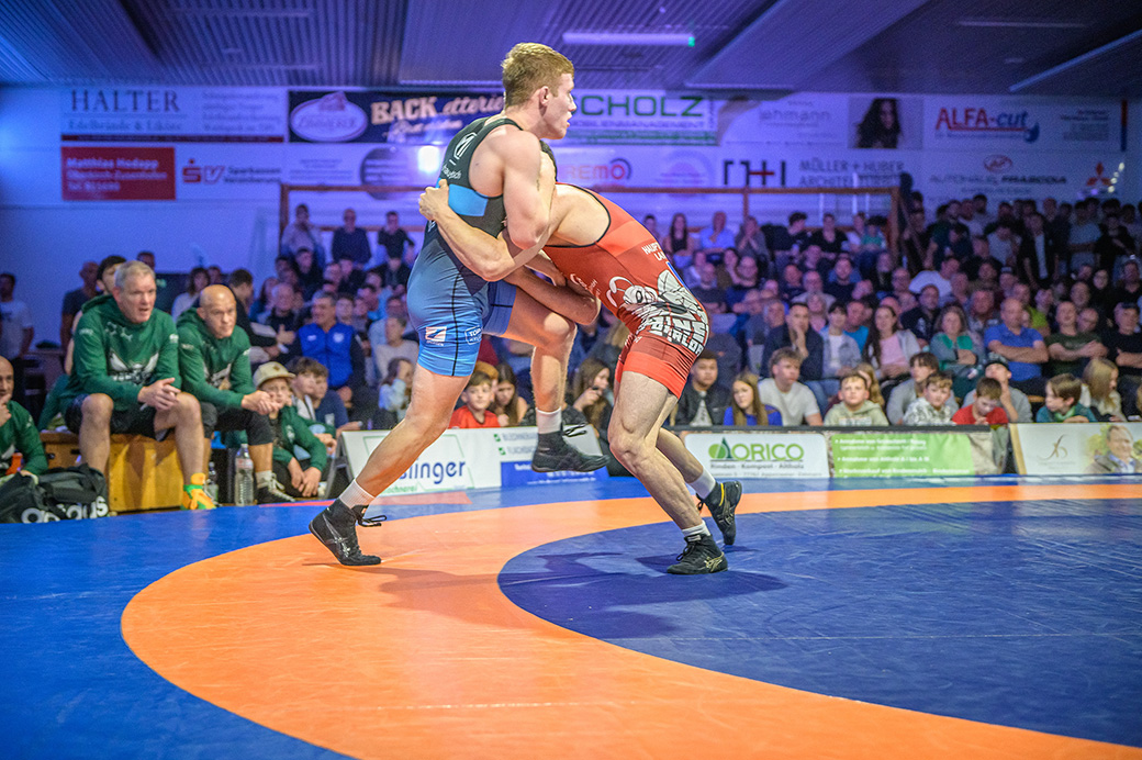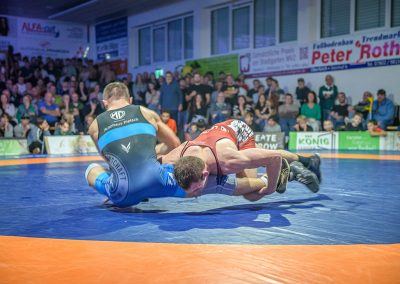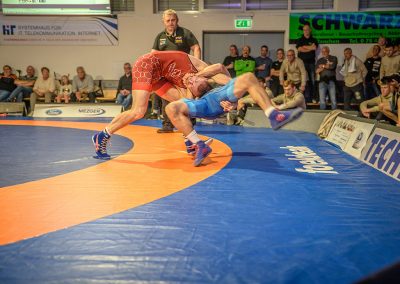 Einen hektischen Kampf bekamen die Fans hier geboten. Mit Joshua Knosp und Richard Schröder standen sich zwei Ringer gegenüber, welche sich auf der Matte nichts schenkten. Während Knosp versuchte seinen Gegner in Bedrängnis zu bringen, versuchte Schröder gezielt zu kontern. Immer wieder beklagte sich der Reilinger über die Ringweise des Hornets. Dies beantwortete Knosp mit einer schönen Aktion, die ihm zwei technische Punkte einbrachte. Nach sechs Minuten stand es 4:2 für den Hornet, und damit 8:6 für Urloffen.