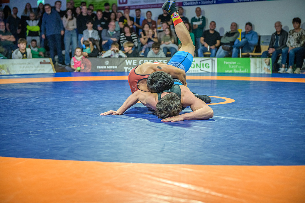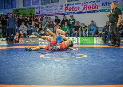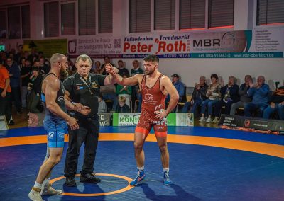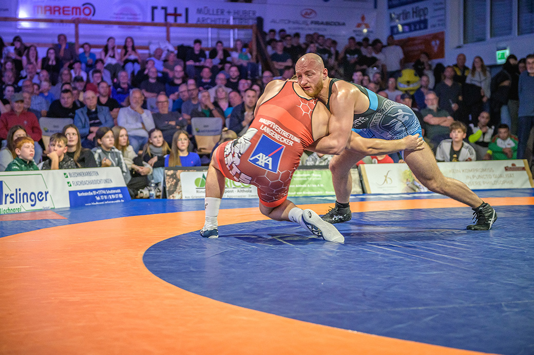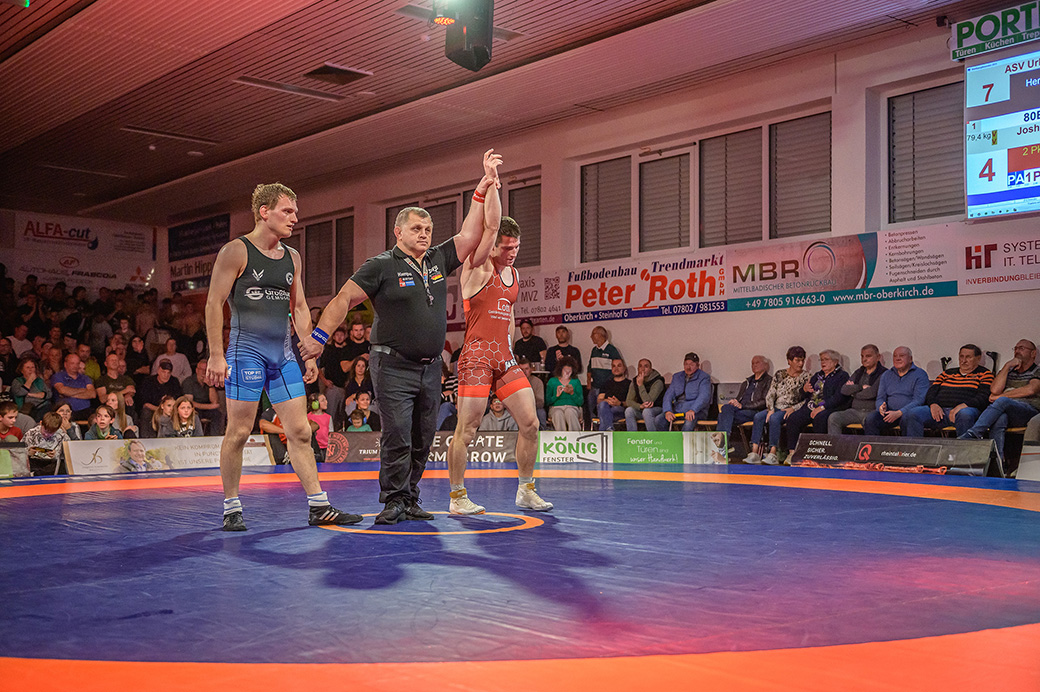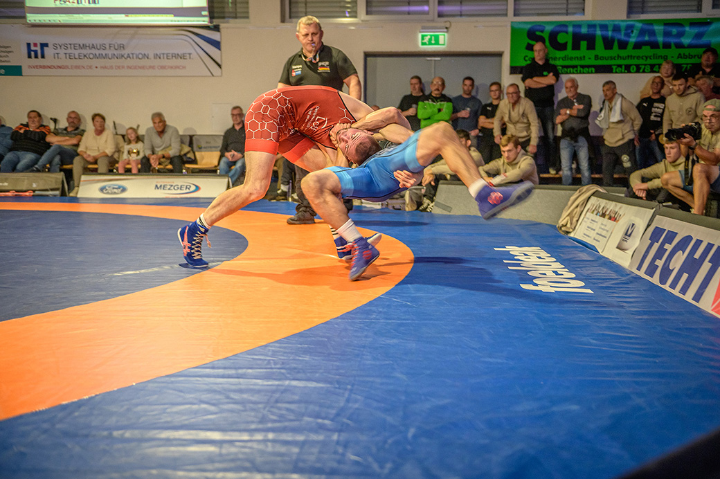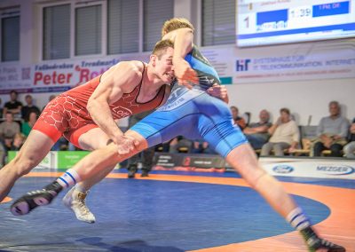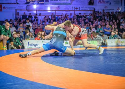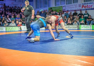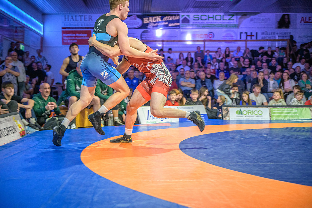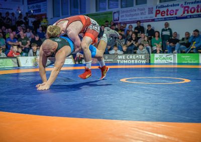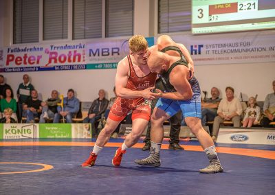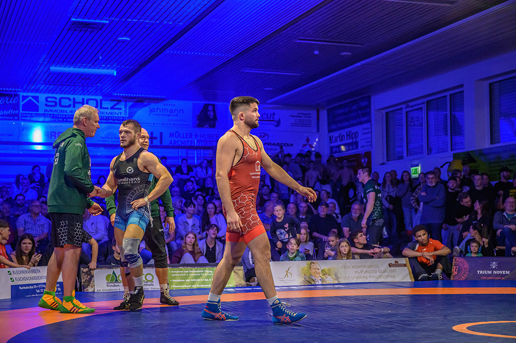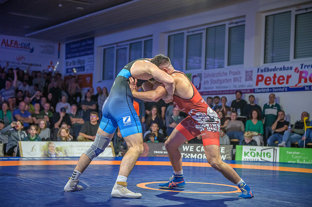Einen hektischen Kampf bekamen die Fans hier geboten. Mit Joshua Knosp und Richard Schröder standen sich zwei Ringer gegenüber, welche sich auf der Matte nichts schenkten. Während Knosp versuchte seinen Gegner in Bedrängnis zu bringen, versuchte Schröder gezielt zu kontern. Immer wieder beklagte sich der Reilinger über die Ringweise des Hornets. Dies beantwortete Knosp mit einer schönen Aktion, die ihm zwei technische Punkte einbrachte. Nach sechs Minuten stand es 4:2 für den Hornet, und damit 8:6 für Urloffen.