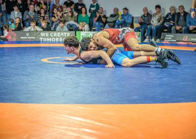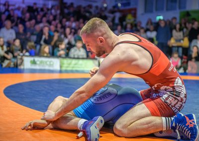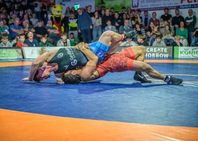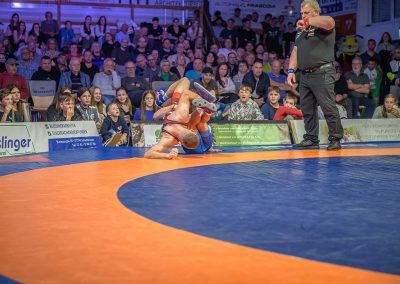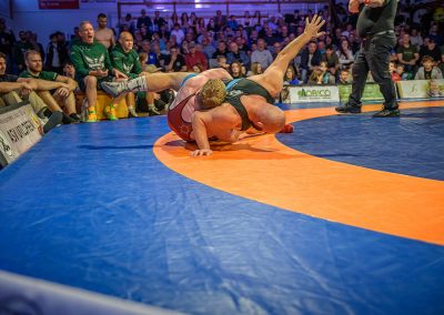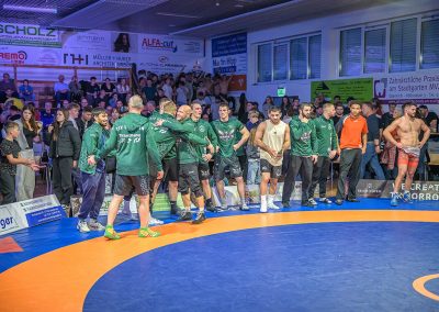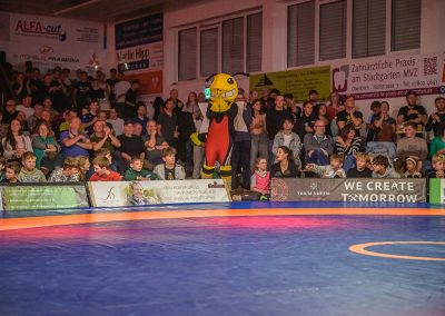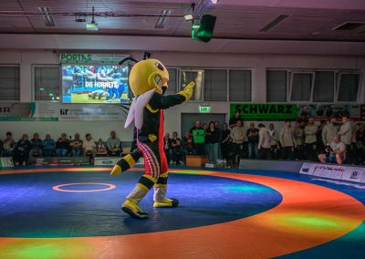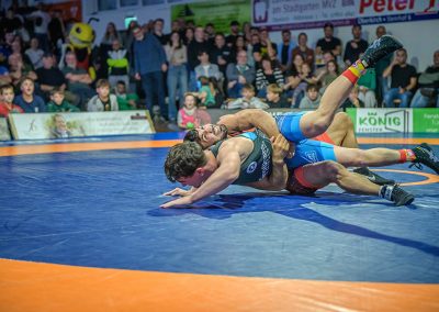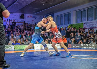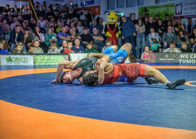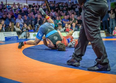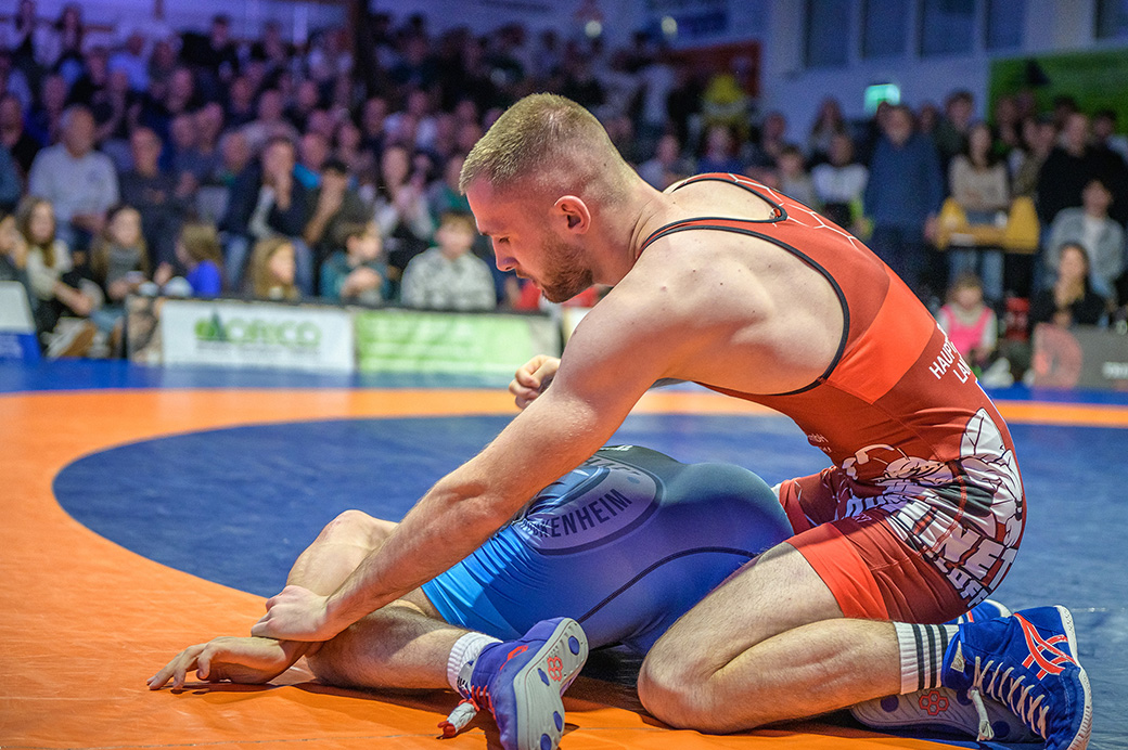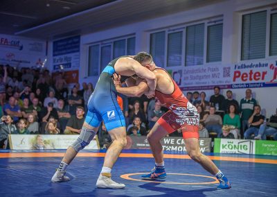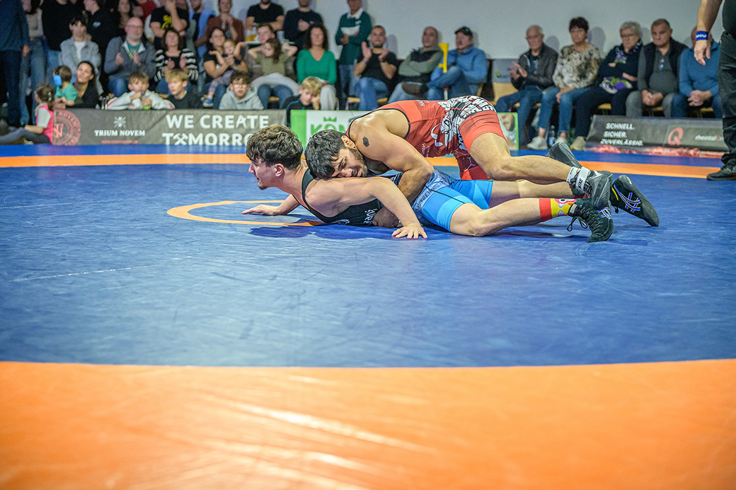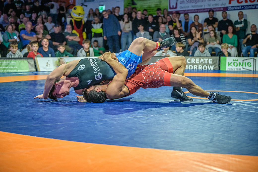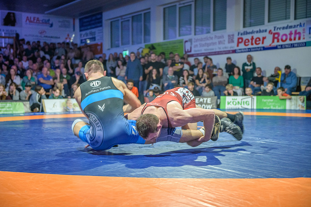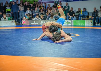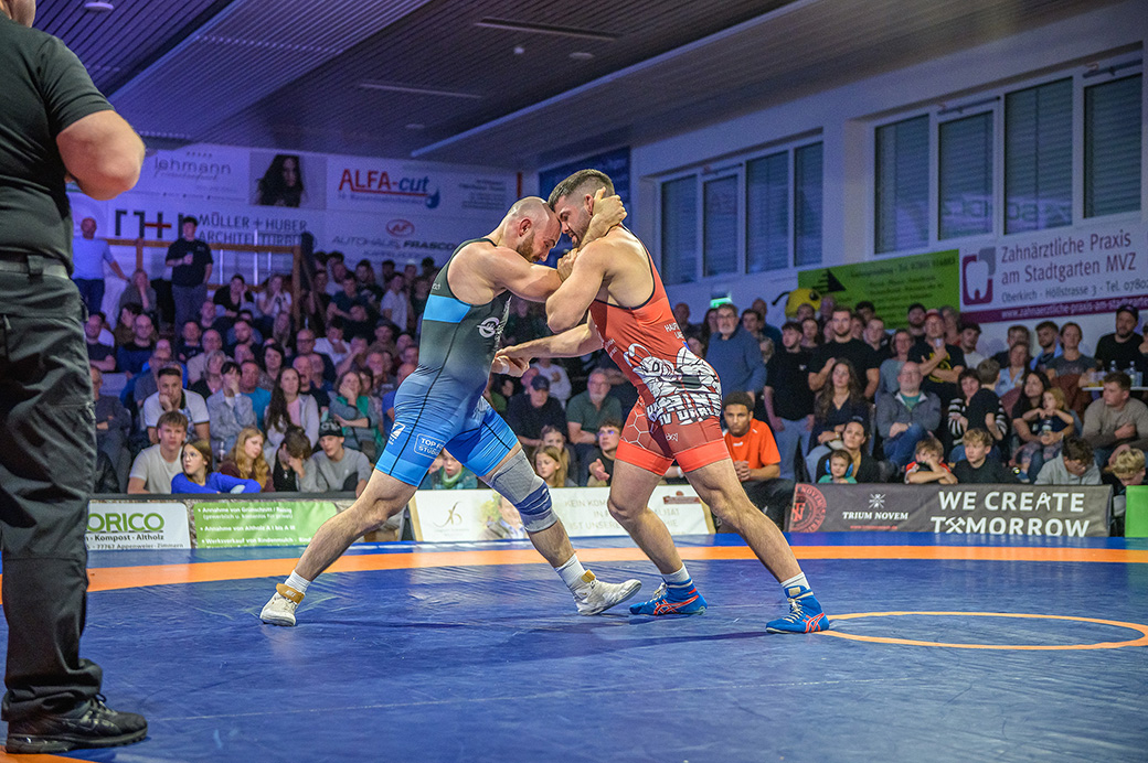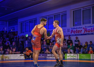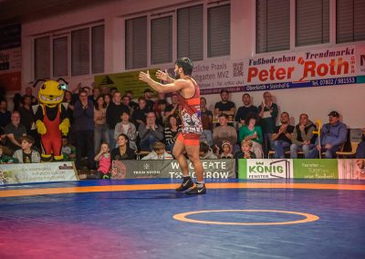 Einen hektischen Kampf bekamen die Fans hier geboten. Mit Joshua Knosp und Richard Schröder standen sich zwei Ringer gegenüber, welche sich auf der Matte nichts schenkten. Während Knosp versuchte seinen Gegner in Bedrängnis zu bringen, versuchte Schröder gezielt zu kontern. Immer wieder beklagte sich der Reilinger über die Ringweise des Hornets. Dies beantwortete Knosp mit einer schönen Aktion, die ihm zwei technische Punkte einbrachte. Nach sechs Minuten stand es 4:2 für den Hornet, und damit 8:6 für Urloffen.