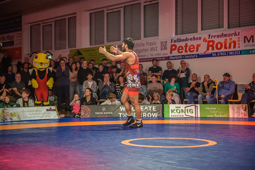 Mit Spannung wurde das Duell von Aik Mnatsakanian für die Hornets gegen den zweifachen Bronzemedaillengewinner Denis Kudla aus Reilingen erwartet. An diesem Kampfabend zeigte der Hornet, warum er zur internationalen Spitze des Ringkampfsports zu zählen ist. Der Hornet kontrollierte den Kampf und konnte einen vielbejubelten 1:0 Sieg für Urloffen erkämpfen, und somit die Meerrettischdörfler auf 5:6 heranbringen.