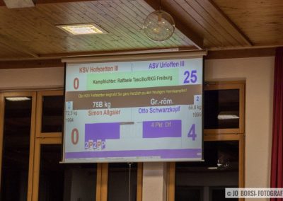Urloffen/Hofstetten…(R.Sch.)… Am vergangenen Samstag trafen in der Oberliga Südbaden der Spitzenreiter und Ligaprimus, der KSV Hofstetten auf den zweitplatzierten, den ASV Urloffen II. Die Siegesserie der Hornets (8 Siege in Folge) ist im Kinzigtal erwartungsgemäß gebrochen. Die ersatzgeschwächten ASV Athleten verloren, trotz ansprechender kämpferischen Leistung, deutlich mit 27:6.