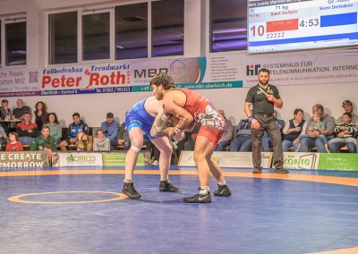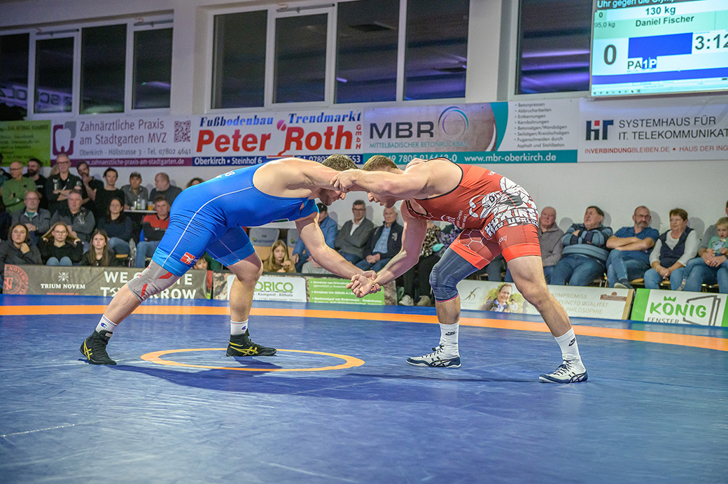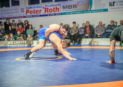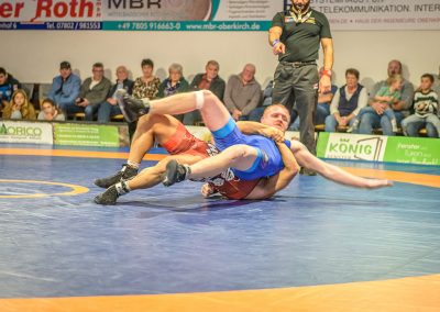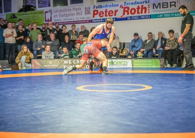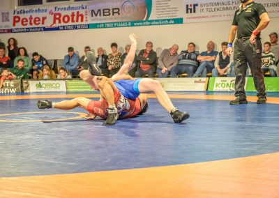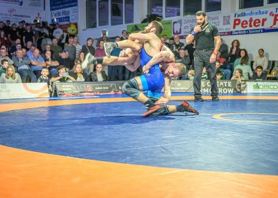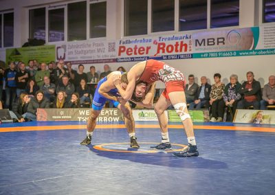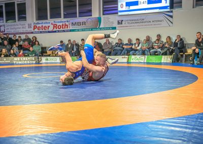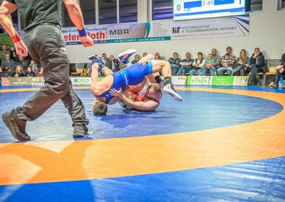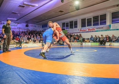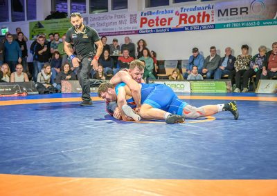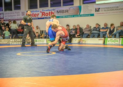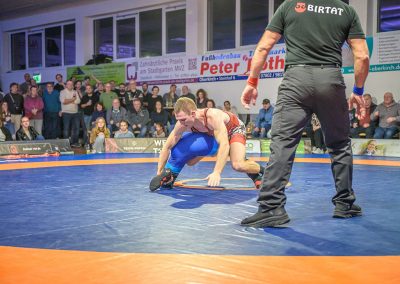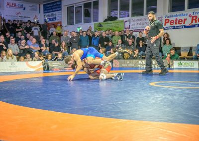 Hier trafen Daniel Fischer und Dennis Balaur aufeinander. Beide Ringer kannten sich aus dem Hinrundenkampf. Damals konnte Fischer das Duell mit 1:0 für sich entscheiden. An diesem Kampfabend hatte der Saarländer Balaur das bessere Ende für sich. Bis kurz vor Ende des Kampfes führte er mit 3:2 Punkten. Daniel Fischer riskierte nochmals einen Angriff, der allerdings gekontert wurde, und nochmals zu einer technischen Wertung des Ringes aus Hüttigweiler und letztlich zu einem 2:0 Sieg der Saarländer führte. (1:2)
