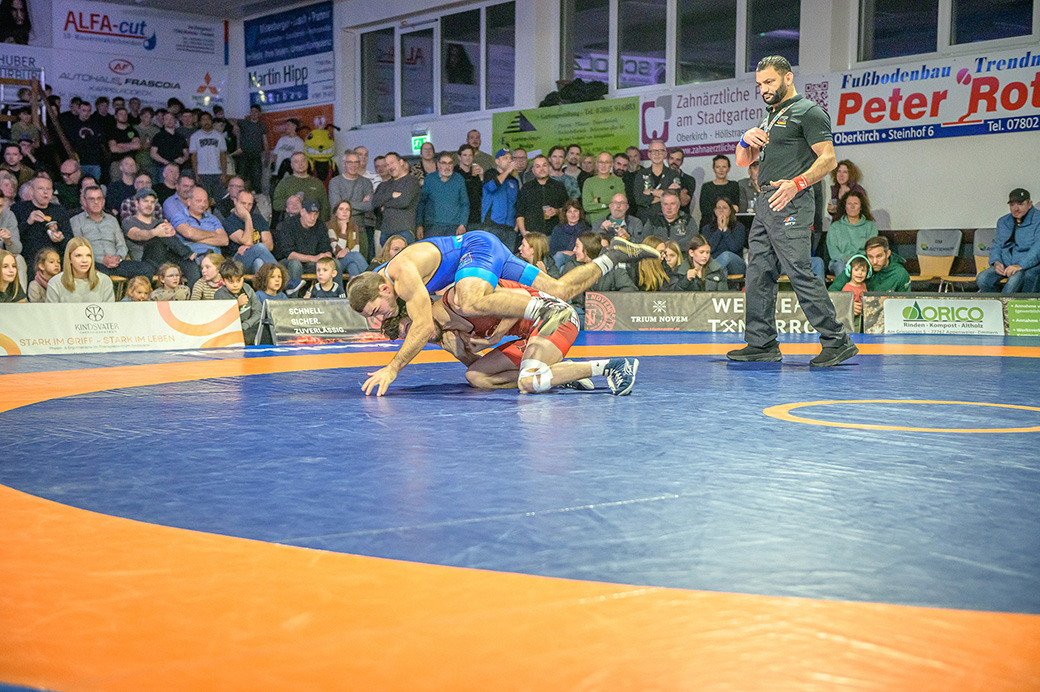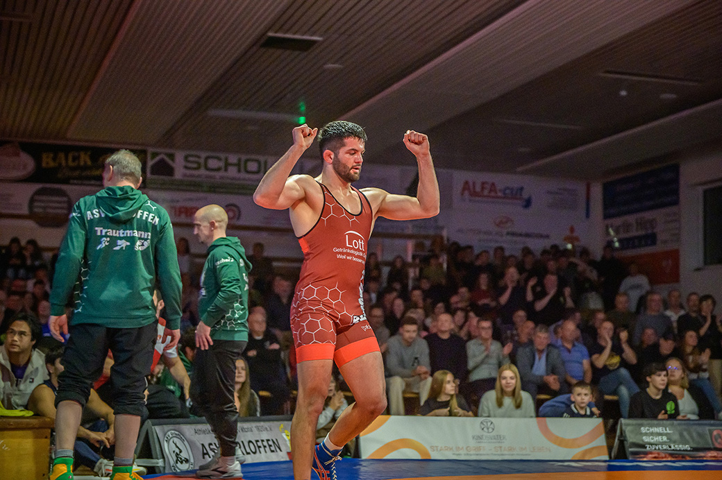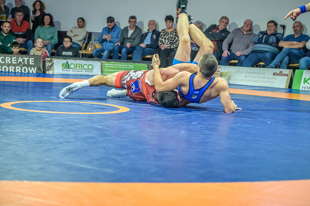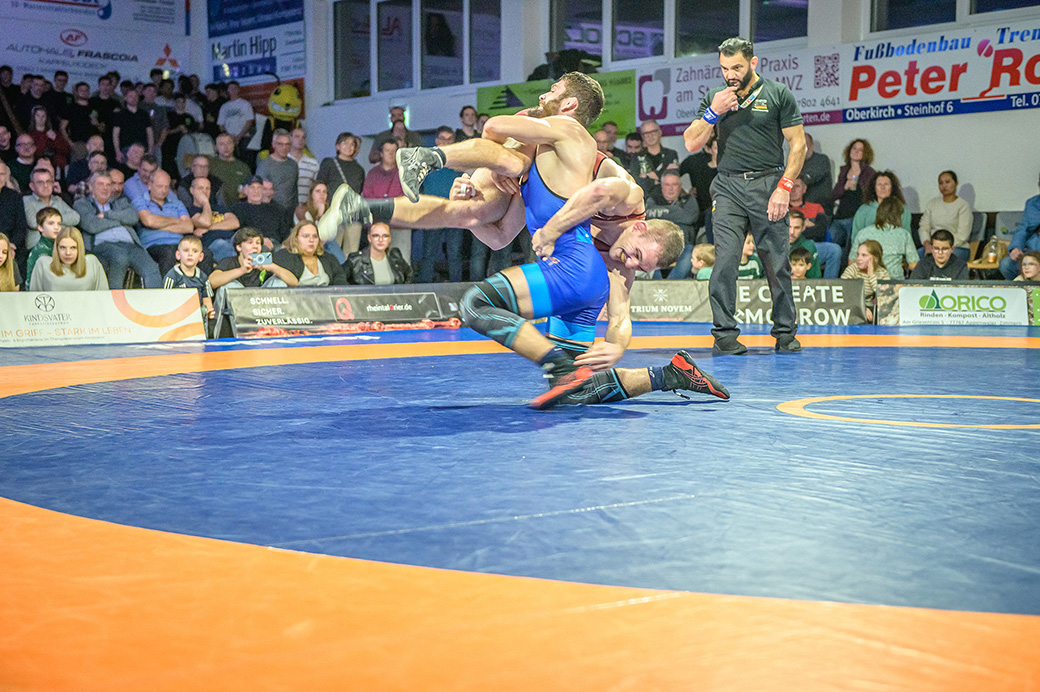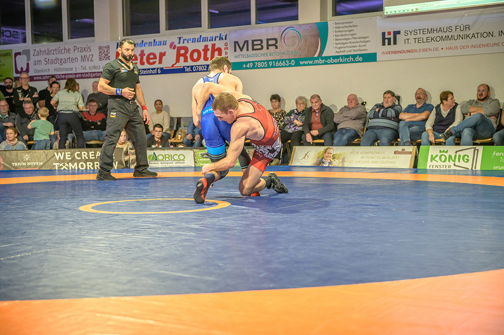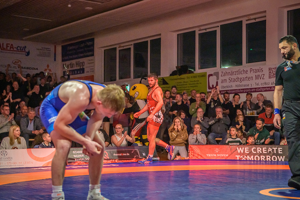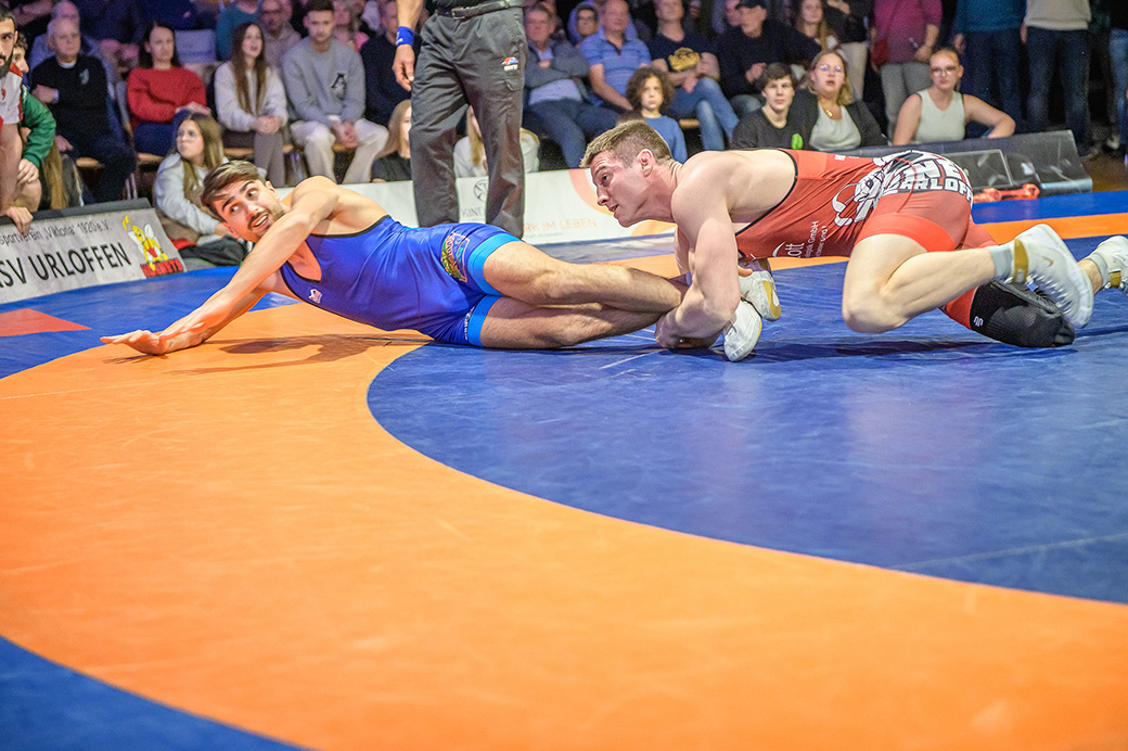 Urloffen…(rs)…Samstag, 29.11. in der ASV Halle. Bundesligakampf zwischen den Hornets aus Urloffen und dem ASV Hüttigweiler aus dem Saarland. Schon beim Einmarsch wird deutlich, heute könnte es richtig eng werden. Im Kader der Meerretichdörfler fehlt mit dem Litauer Mindaugas Venckaitis einer der Siegringer verletzungsbedingt beim Tabellenführer. Bis zum letzten Kampf des Abends mussten die Hornets zittern. Letztlich konnte Domenik Chelo und Joshua Knosp mit ihren Siegen das Ergebnis noch zu Gunsten der Ortenauer Ringerstaffel drehen. Damit ist klar, mit einem weiteren Sieg aus den abschließenden drei Mannschaftskämpfen wäre die Meisterschaft in der 2. Bundesliga Süd gesichert.