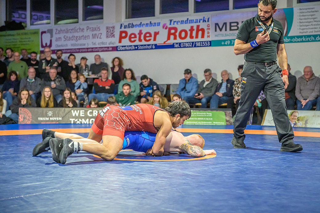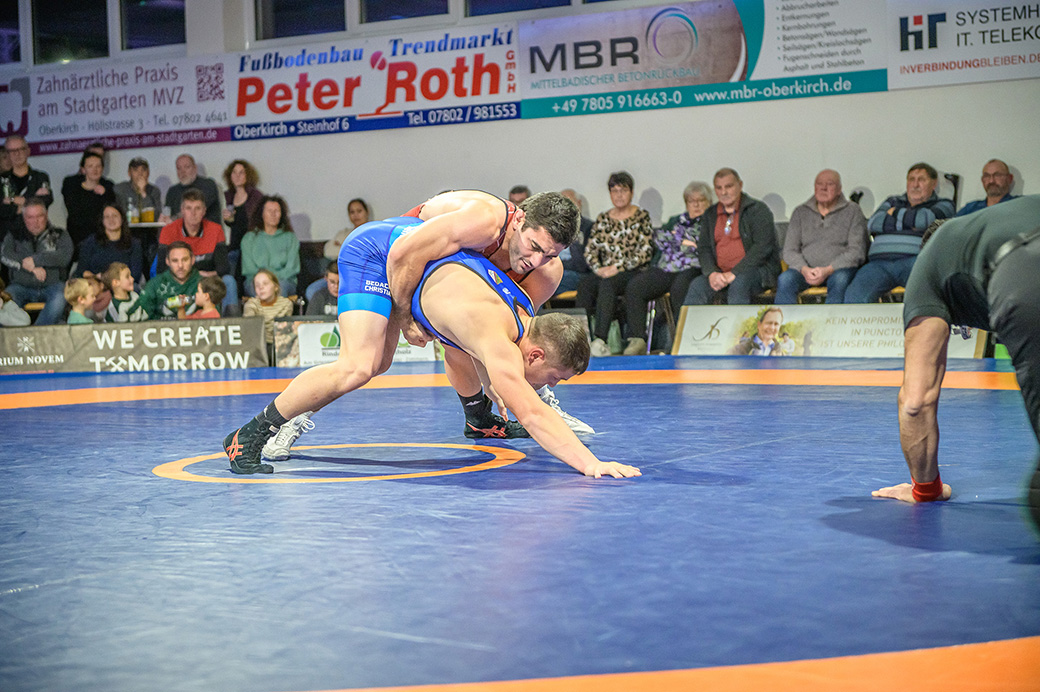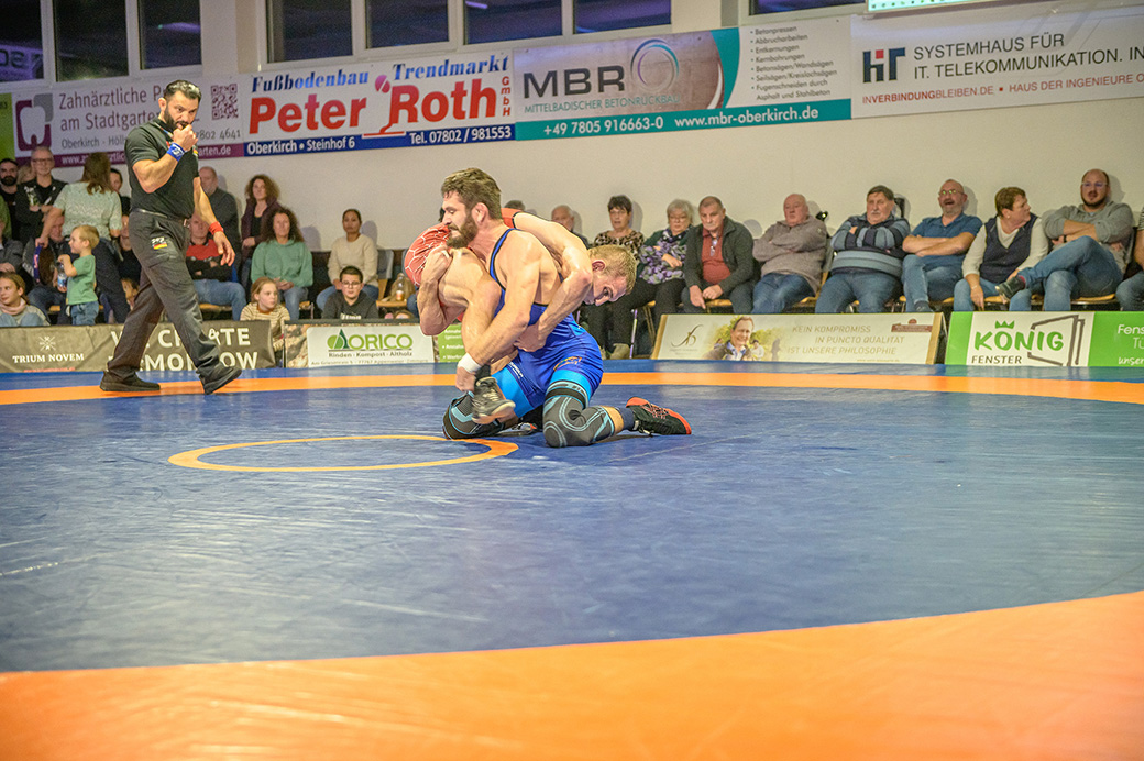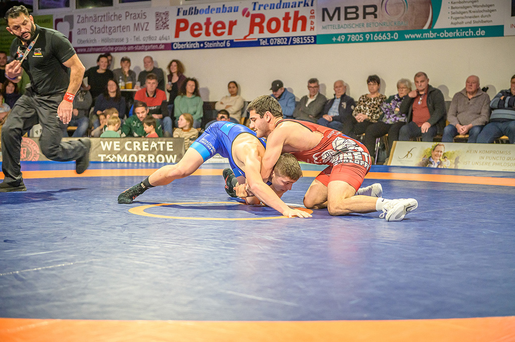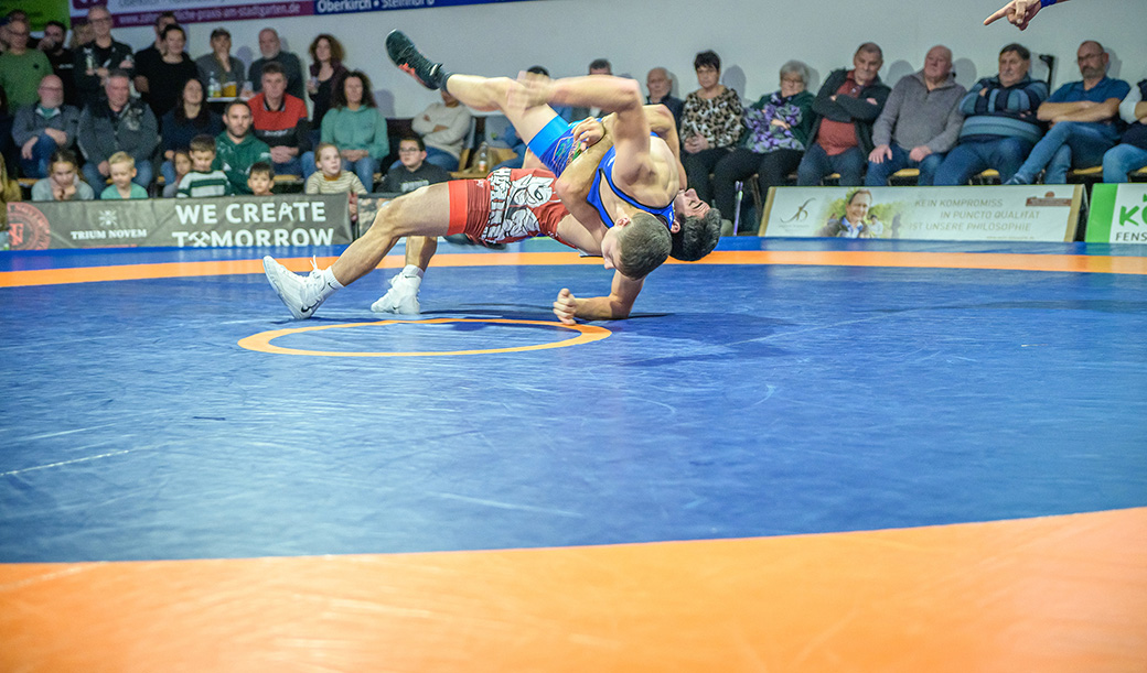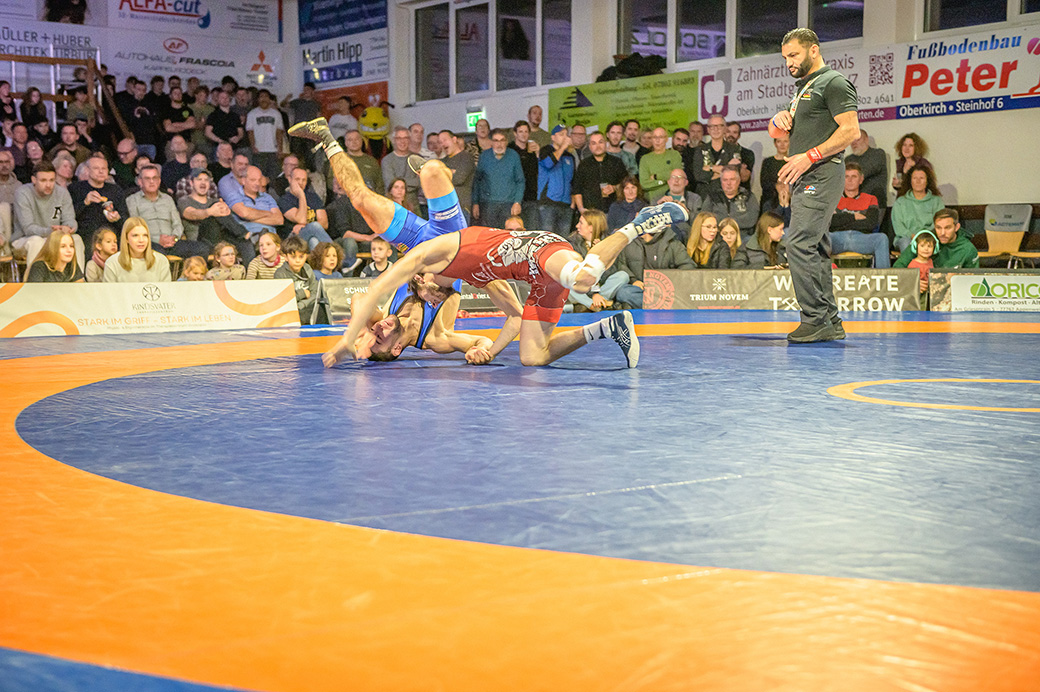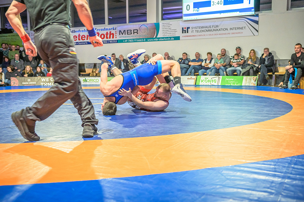 Urloffen…(rs)…Samstag, 29.11. in der ASV Halle. Bundesligakampf zwischen den Hornets aus Urloffen und dem ASV Hüttigweiler aus dem Saarland. Schon beim Einmarsch wird deutlich, heute könnte es richtig eng werden. Im Kader der Meerretichdörfler fehlt mit dem Litauer Mindaugas Venckaitis einer der Siegringer verletzungsbedingt beim Tabellenführer. Bis zum letzten Kampf des Abends mussten die Hornets zittern. Letztlich konnte Domenik Chelo und Joshua Knosp mit ihren Siegen das Ergebnis noch zu Gunsten der Ortenauer Ringerstaffel drehen. Damit ist klar, mit einem weiteren Sieg aus den abschließenden drei Mannschaftskämpfen wäre die Meisterschaft in der 2. Bundesliga Süd gesichert.