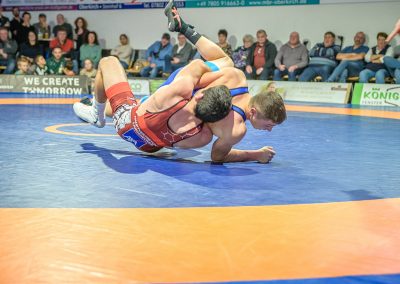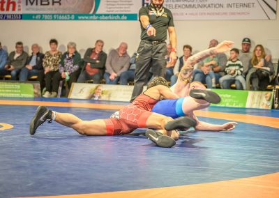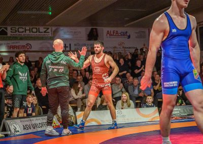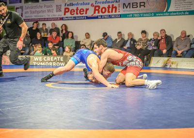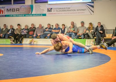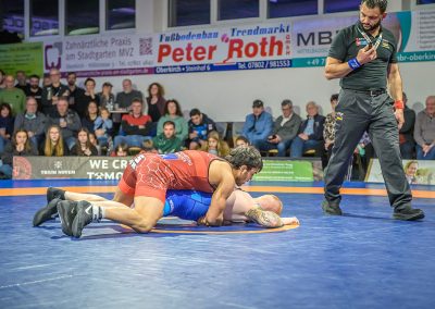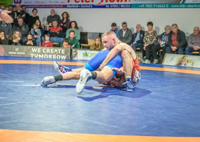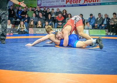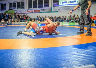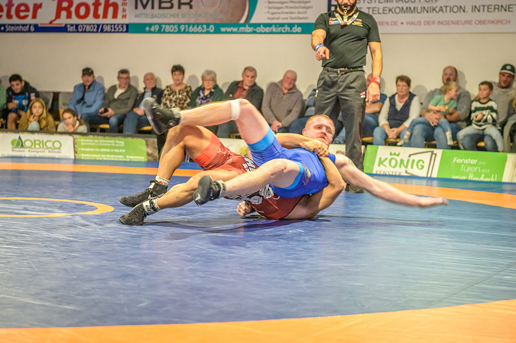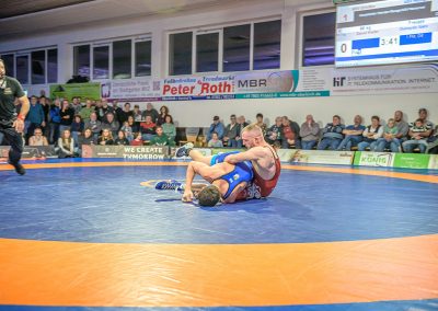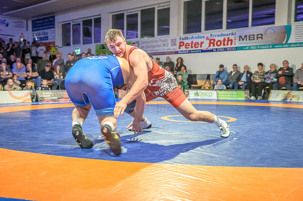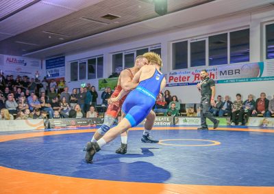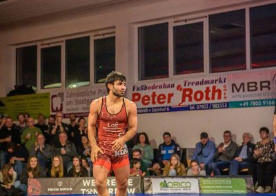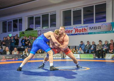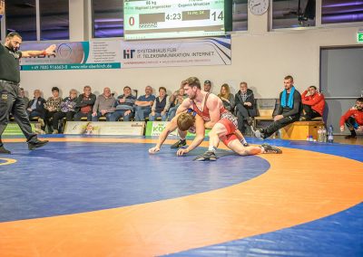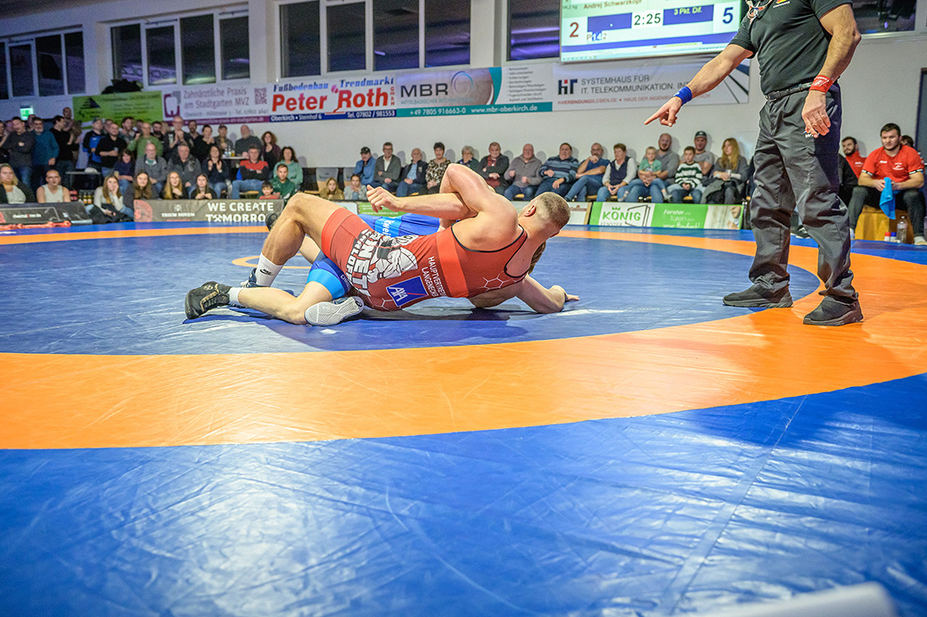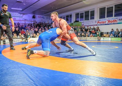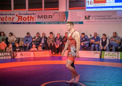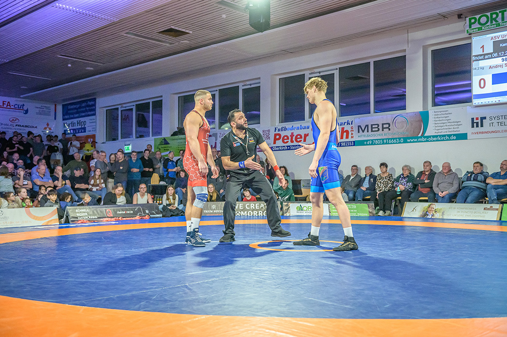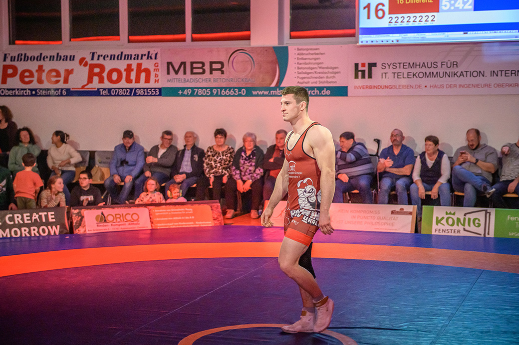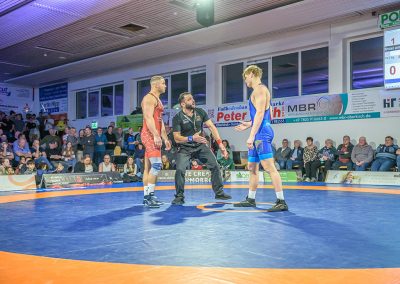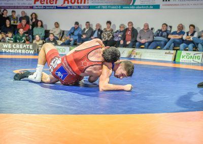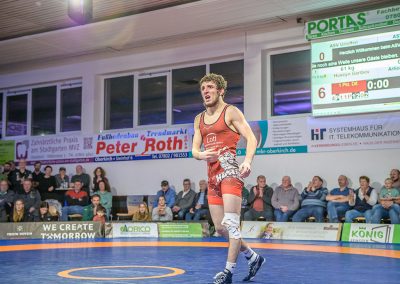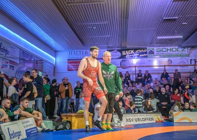 Stammringer Mindaugas Venckaitis verletzt nicht im Kader. Alle waren gespannt, wie sich Andrej Schwarzkopf, ein ausgewiesener Freistilspezialist, im griech.-röm. Stil gegen seinen Gegner Jan Krempin behaupten würde. Krempin, der bei Deutschen Meisterschaften schon mehrfach eine Medaille gewonnen hatte, dominierte den Kampf und ging mit 5:0 in Führung. Dann hatte sich das Urloffener Eigengewächs auf seinen Gegner eingestellt. In der zweiten Kampfhälfte konnte der junge Hornet auf 3:5 verkürzen. Kurz vor Ende des Kampfes konnte Krempin nochmals eine technische Wertung erzielen, und so zwei weitere Punkte für die Saarländer sichern. Stand: 1:6