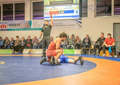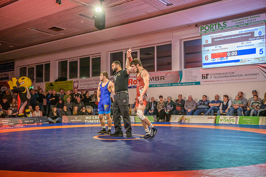 Hoch motiviert ging Huseyn Garibov für die Hornets in den Kampf. Bereits nach 30 Sekunden konnte er seinen Gegner Artiom Deleanu durch einen ansatzlos gezogenen Schwunggriff in eine gefährliche Lage bringen, aus der sich der Saarländer allerdings nochmals befreien konnte. Bis zur 4 Minute konnte Garibov seine Führung auf 6:0 ausbauen, bevor sein Gegner punkten konnte. Am Ende stand es 6:5 für den Hornet. Urloffen führte mit 1:0