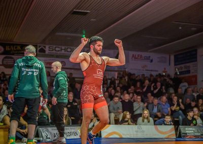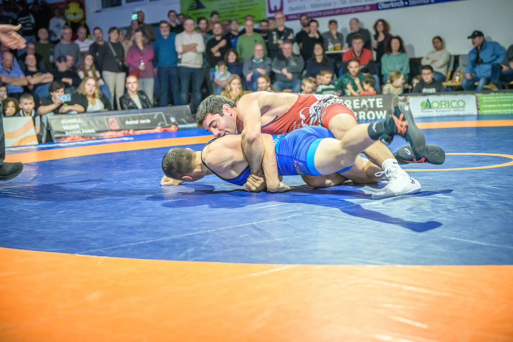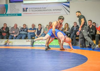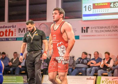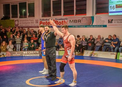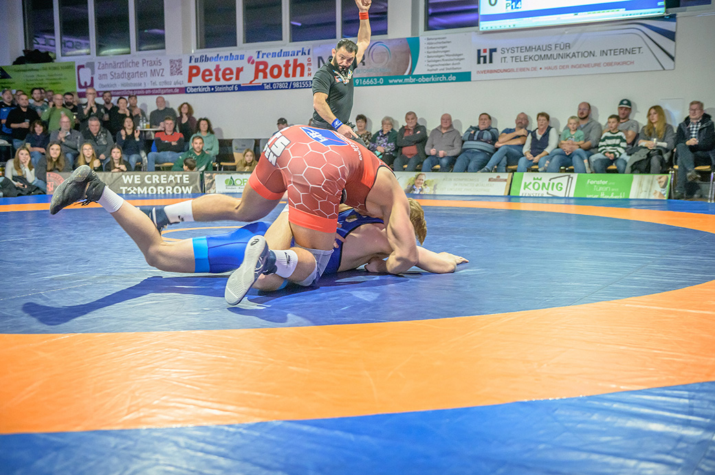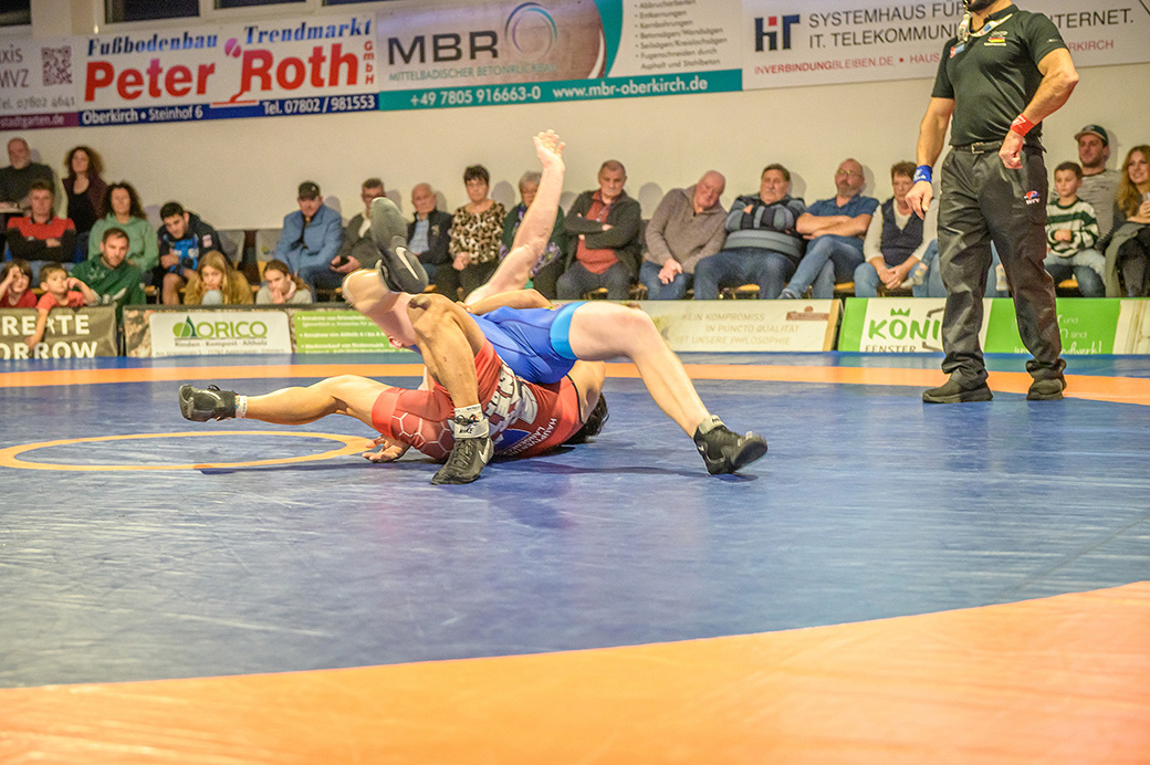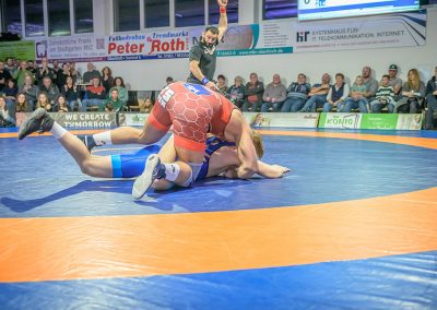 David Kiefer hatte es an diesem Abend mit dem Franzosen Oubayda Itaev zu tun. Die Zuschauer erlebten sechs Minuten lang ein Wechselbad der ihrer Gefühle. Jede Kampfsituation wurde von beiden Ringern ausgekämpft, kein Punkt vorzeitig abgegeben. Die Führung im Kampf wechselte ständig. Nach sechs Minuten hatte allerdings der Saarländer mit 11:8 Punkten den Sieg auf seiner Seite. Zwei weitere Punkte gingen damit auf das Mannschaftskonto von Hüttigweiler. (1:4)