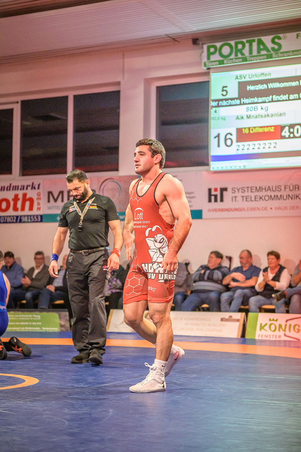 Aik Mnatsakanian hatte vom Trainerteam Sascha Wachter und Harald Hertwig die Order die volle Punktzahl zu erkämpfen, um die Siegchance der Meerrettichdörfler zu wahren. Und der Hornet mit bulgarischer Nationalität lieferte. Sein Gegner Kevin Titov hatte den Bodentechniken von Mnatsakanian nichts entgegenzusetzen. Nach zwei Minuten stand der 16:0 Sieg des Hornets, unter dem Jubel der Fans, fest. Urloffen kam wieder auf 9:12 heran.