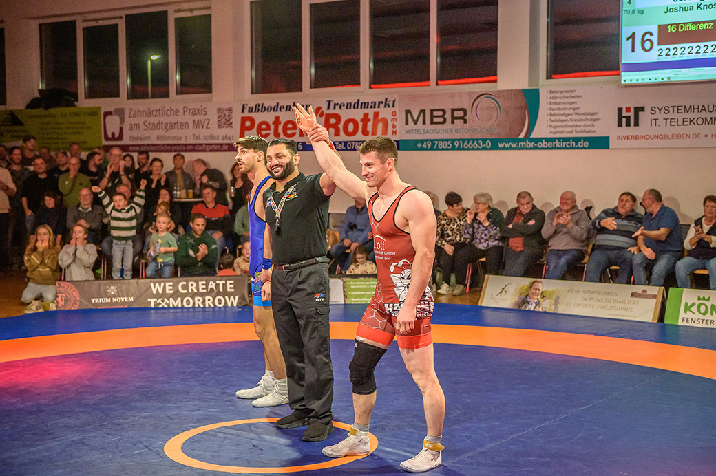 Im letzten Kampf des Abends lag es an Joshua Knosp, das Kampfergebnis zu drehen. Mindestens drei Mannschaftspunkte waren das Ziel. Knosp bekam seinen Gegner Luca Taibi gleich zu Beginn des Kampfes in der Beinschraube zu fassen, aus der sich der Saarländer nicht mehr befreien konnte. Unter dem Jubel der Mannschaft und der Fans war der Kampf bereits nach einer Minute mit der maximalen Punktzahl von 4 Punkten für die Hornets beendet, und damit das Gesamtergebnis auf 14:12 für die Hornets gedreht.