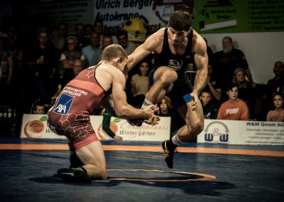 Daniel Fischer hatte mit Adlan Tasuyeu (Belarus) erneut einen Top-Athleten vor der Brust. Der junge Urloffener wehrte sich gegen den starken Gästeringer konnte auch zweimal Punkten musste sich am Ende aber mit 4:13 geschlagen geben. (8:5)