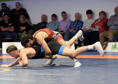 Florian Neumeier hatte den Deutschen Shootingstar Deni Nakaev als Kontrahenten. Im mit Spannung erwartenden Generationenduell zeigte Florian Neumaier erneut eine herausragende Leistung. Neumaier war dem U20 Weltmeister von 2022 und amtierende 3. U23 Europameister physisch im Standkampf überlegen. Zwei Verwarnungen wegen Passivität und ein Durchdreher brachten den Urloffener mit 4:0 in Führung. Antonio Silvestri, der an diesem Abend das ein oder andere Mal kein glückliches Händchen hatte schickte den Urloffener kurz vor der letzten Minute in die Bodenlage, aus der der Gast eine Zweierwertung erzielen konnte. Am Ende stand ein verdientes 4:2 für Florian Neumaier an der Anzeigetafel. (9:9)
