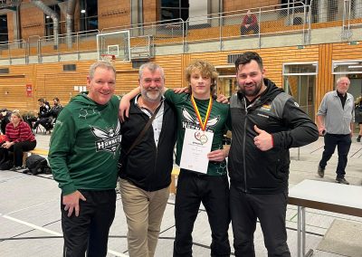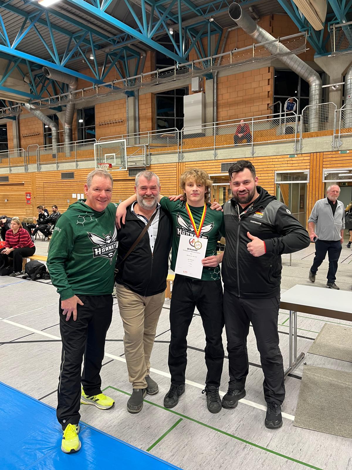 Hoch motiviert und sehr gut auf die Meisterschaft eingestellt präsentierte sich Leander Irslinger in der Gewichtsklasse bis 62 kg. Weder Arthur Betz (TuS Adelhausen), Yusuf Böhm (RG Eiche Allensbach) noch Silas Sucker (KSV Vöhrenbach) konnten Irslinger gefährden. Nach drei Schultersiegen stand der Meistertitel für den jungen Hornet fest.