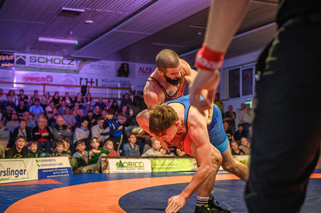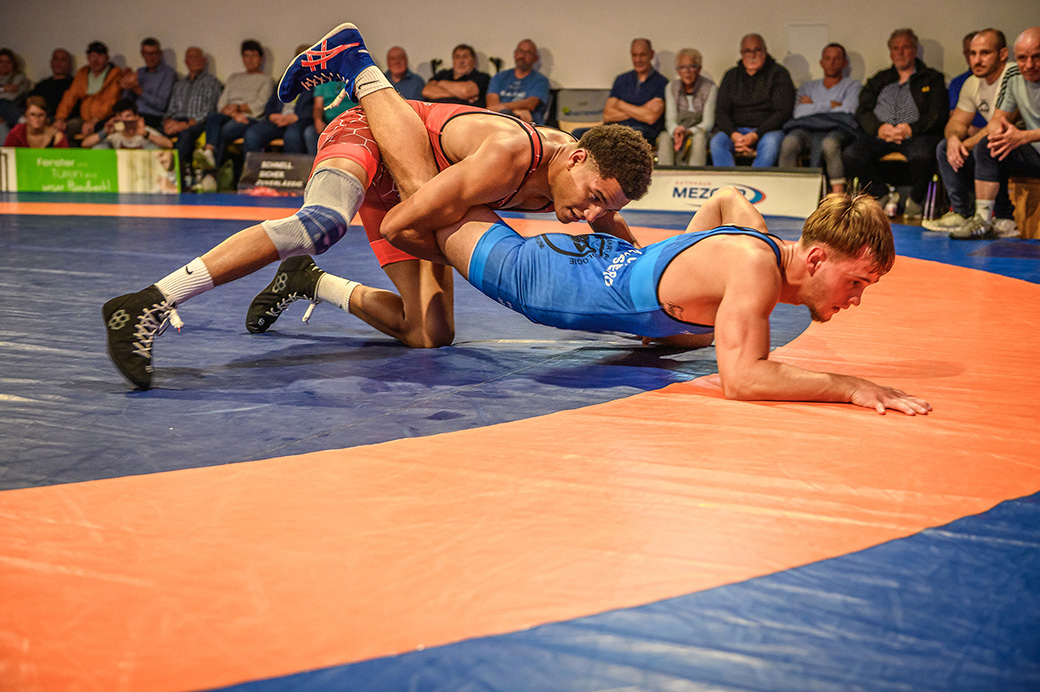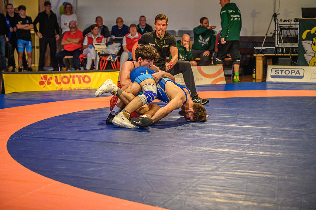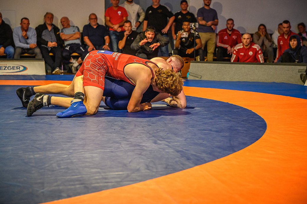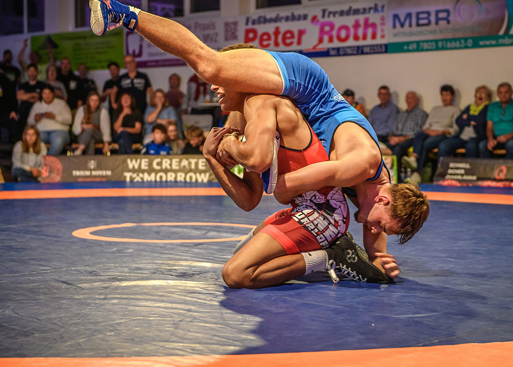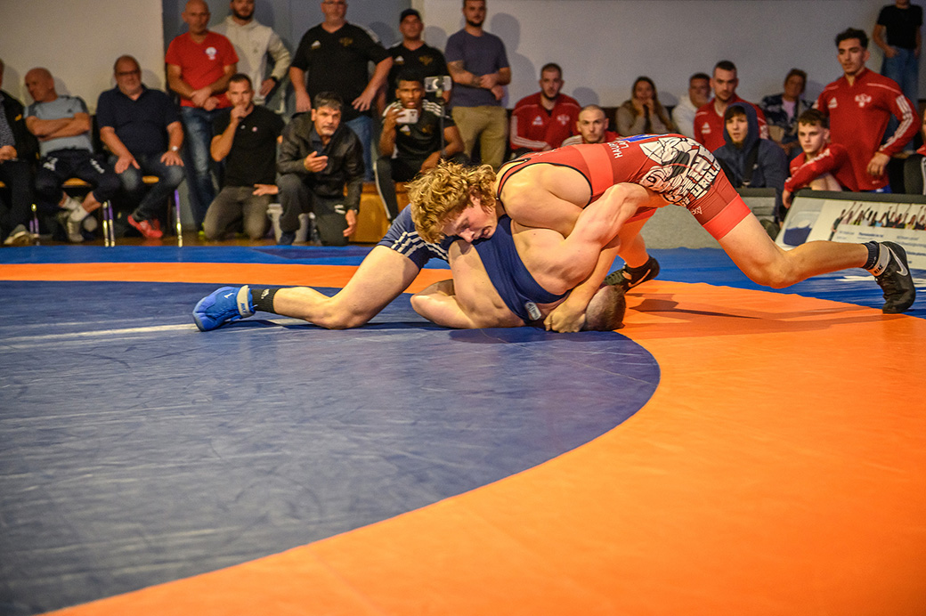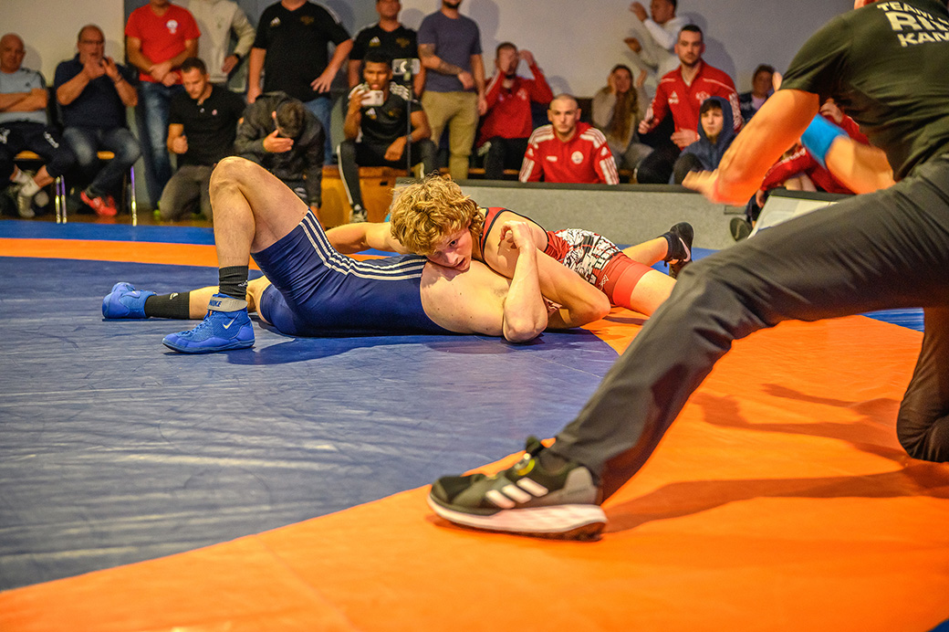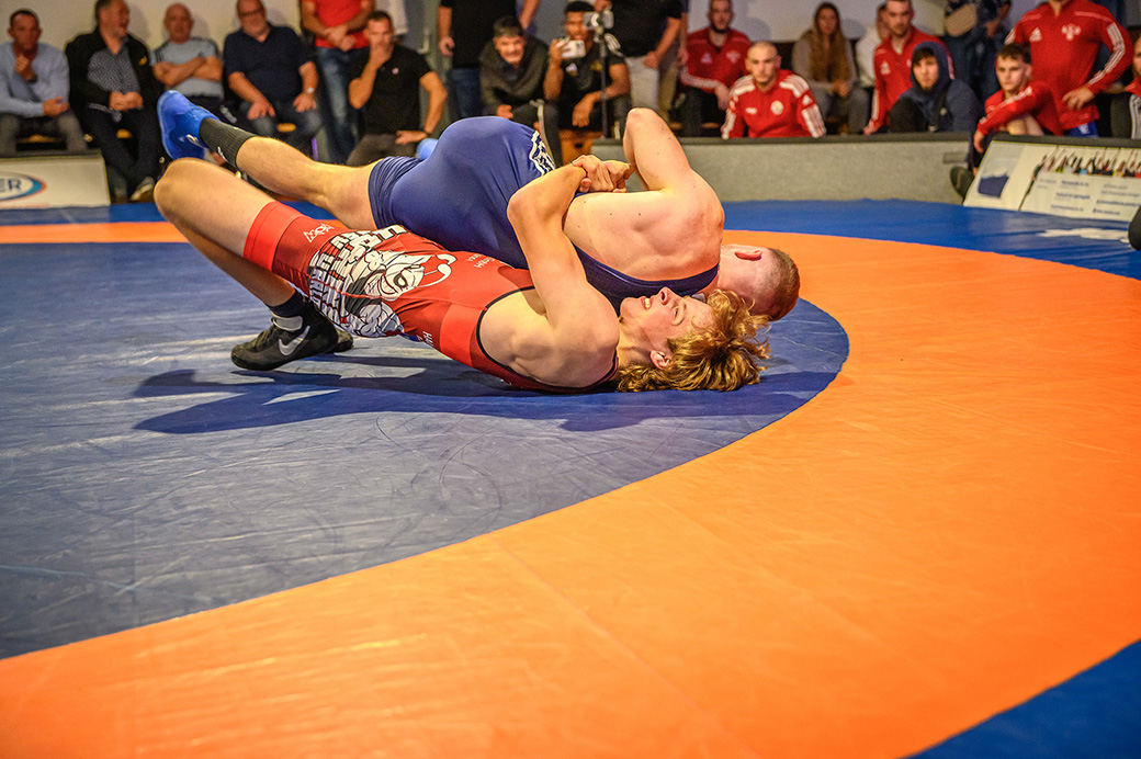 61 kg (gr.-röm.) Leon Schmidt musste kaum eingreifen. Sein Gegner David Heissler kam bereits angeschlagen auf die Matte und ließ sich nach wenigen Sekunden schultern. (5:2)