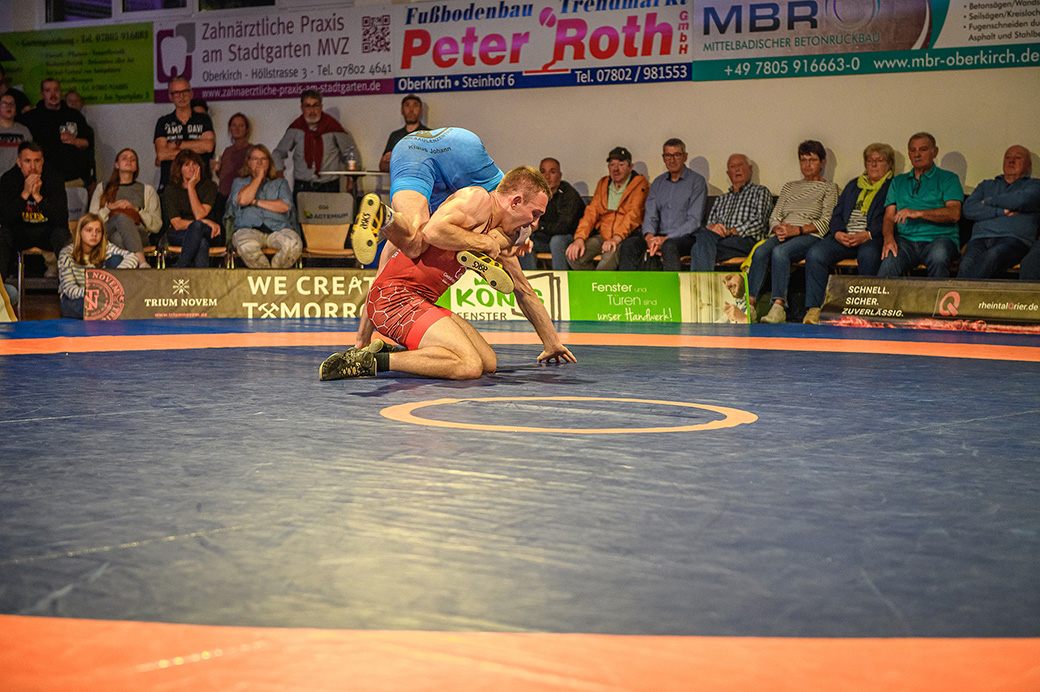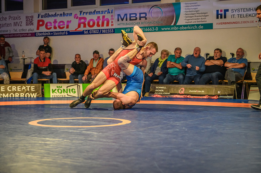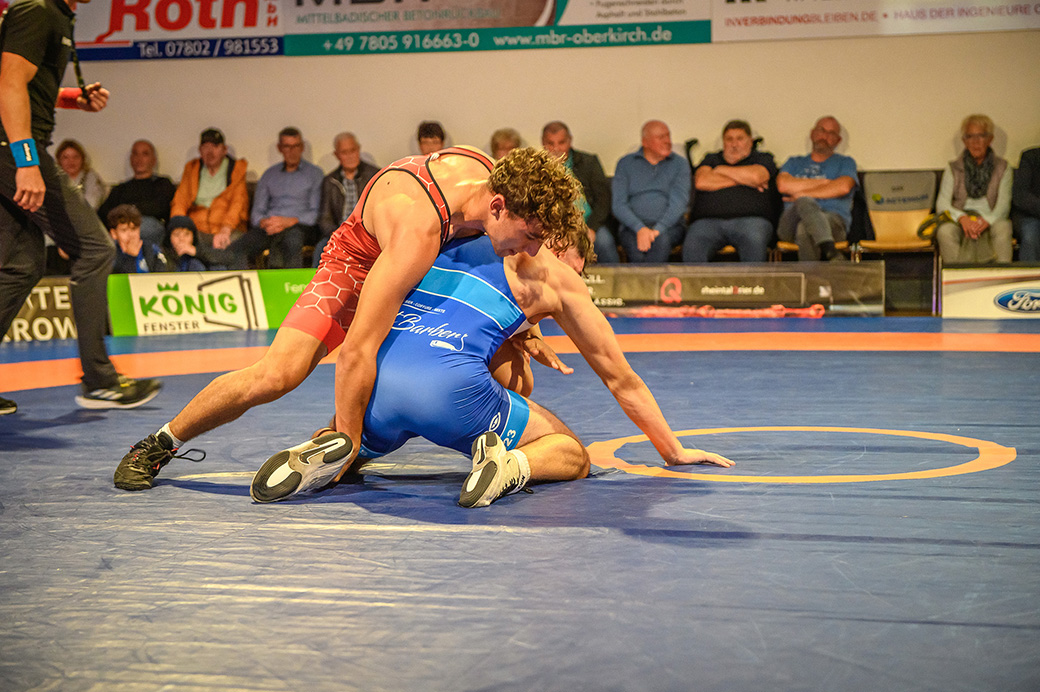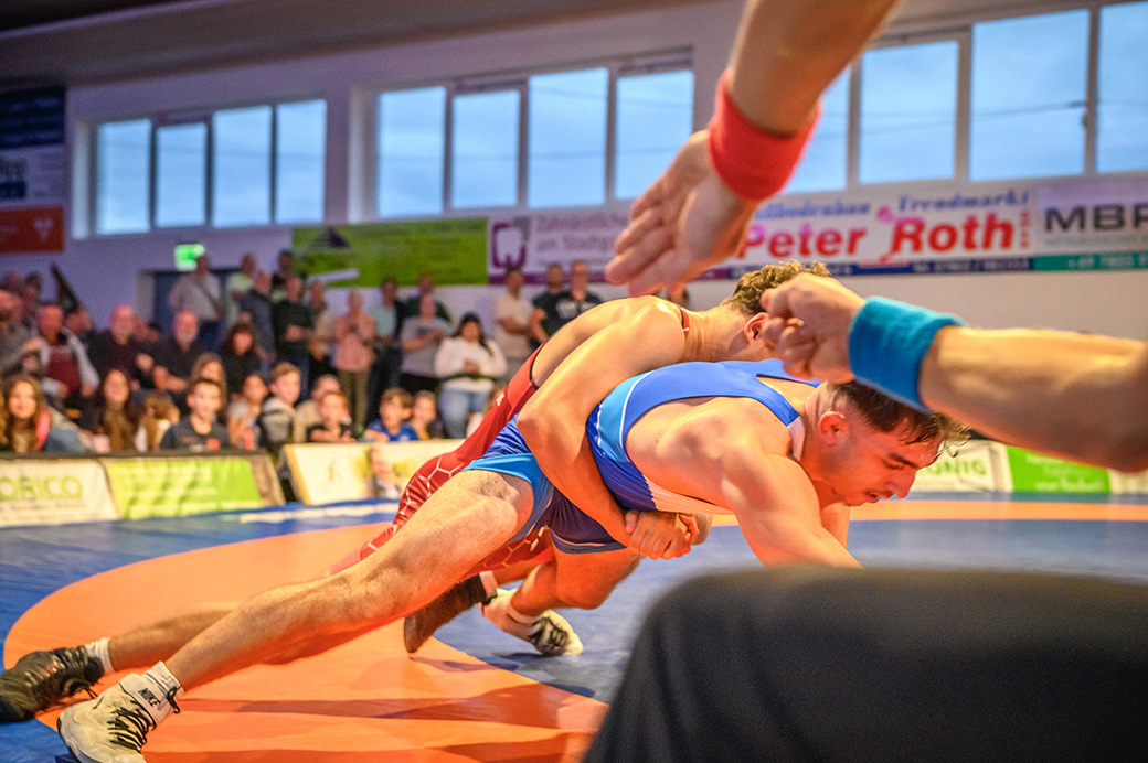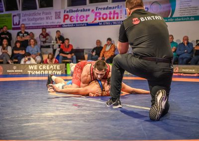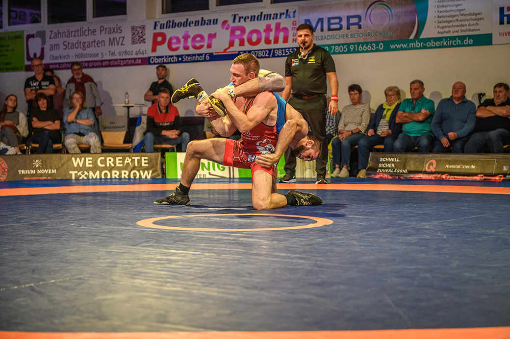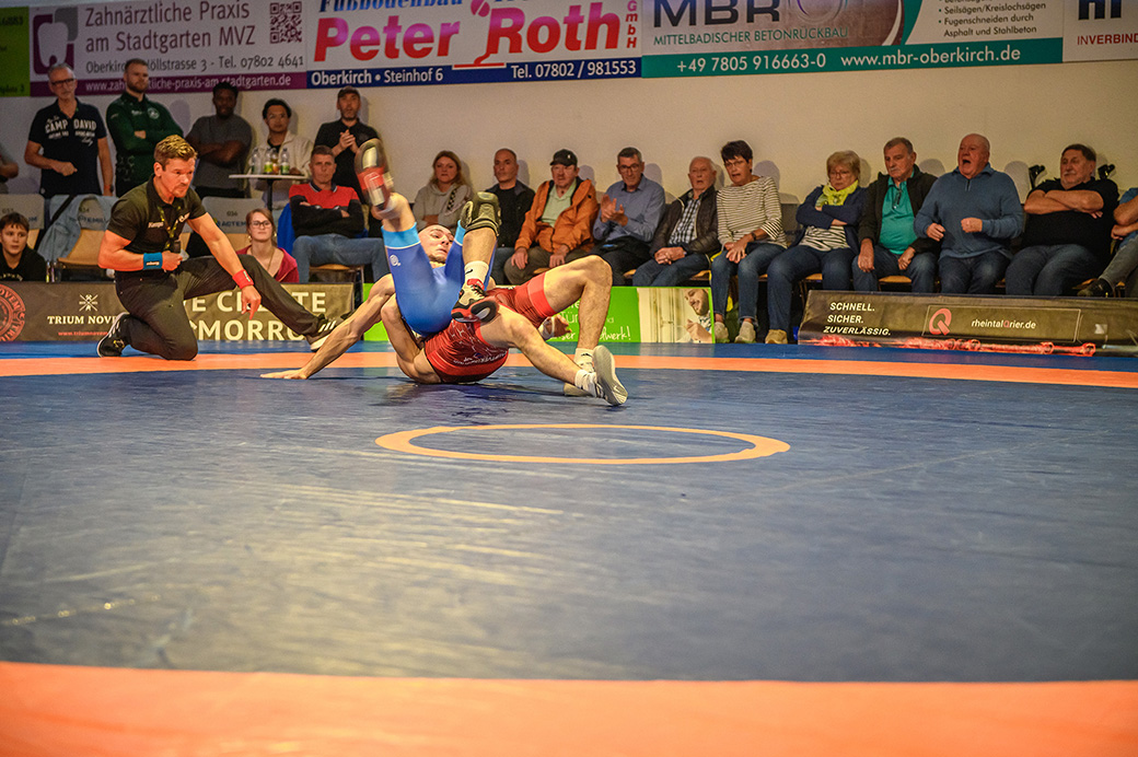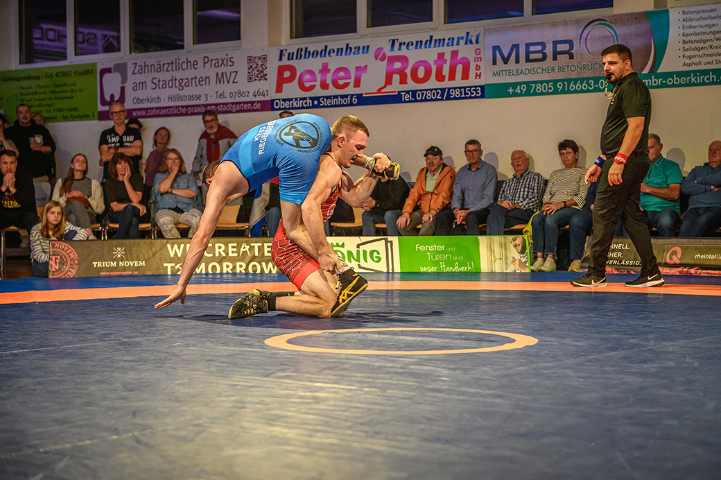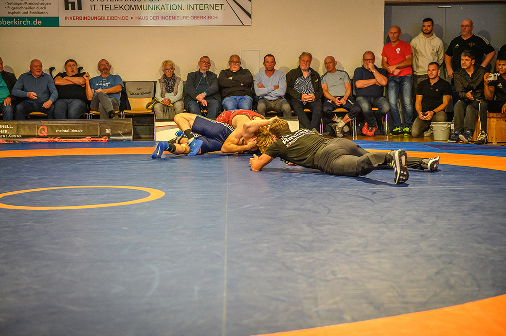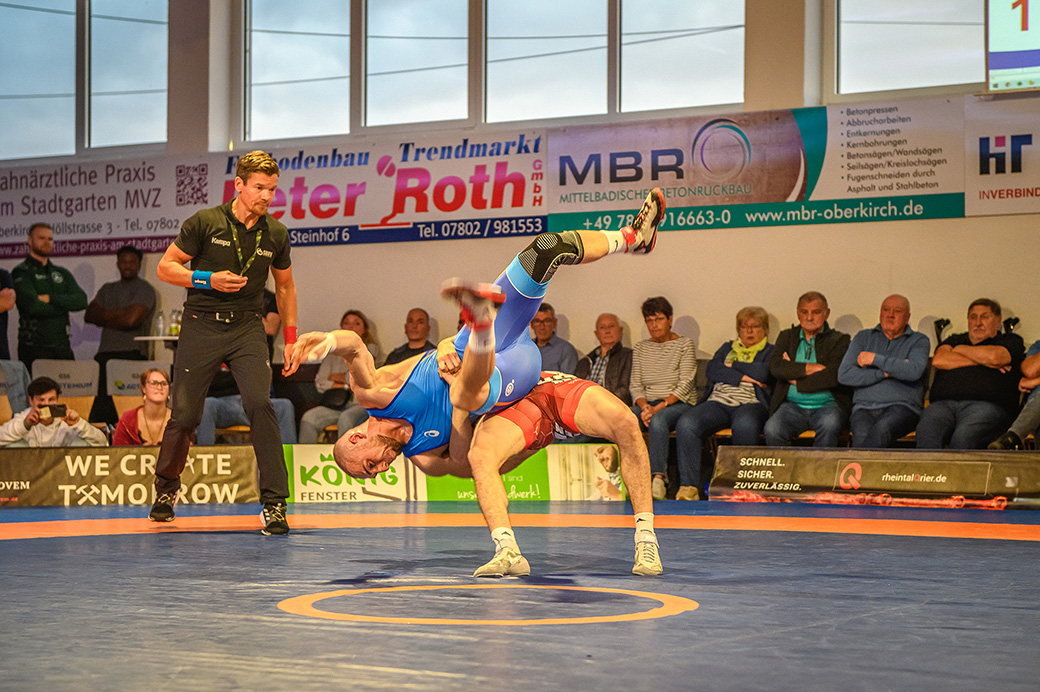 61 kg (gr.-röm.) Leon Schmidt musste kaum eingreifen. Sein Gegner David Heissler kam bereits angeschlagen auf die Matte und ließ sich nach wenigen Sekunden schultern. (5:2)