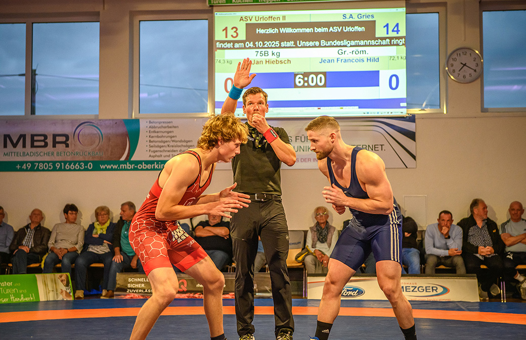 61kg (Freistil): Im ersten Kampf des Abends bekam es David Kiefer mit dem französischen Spitzenringer Rassoul Galbouraev zu tun. Der Urloffener fand kein Mittel, um die Angriffe des Saarländers abzuwehren. Am Ende stand es 0:15 gegen Kiefer. Urloffen lag mit 4 Punkten zurück.