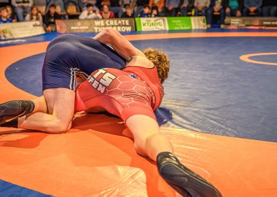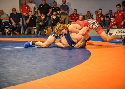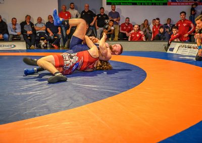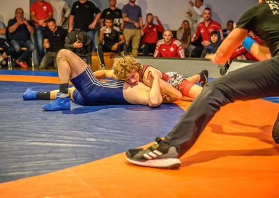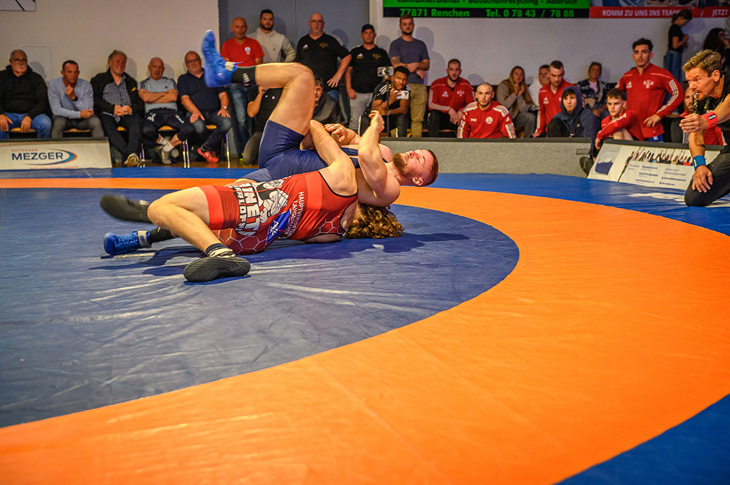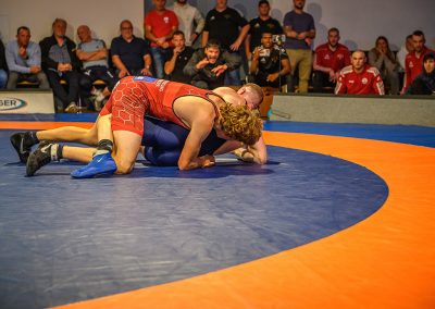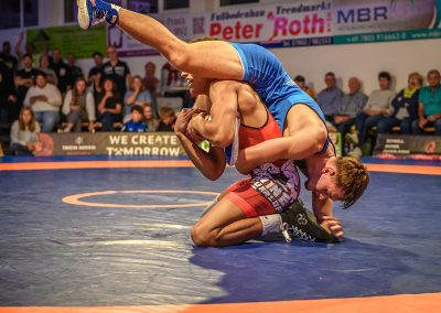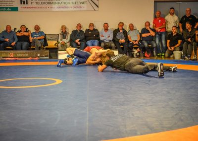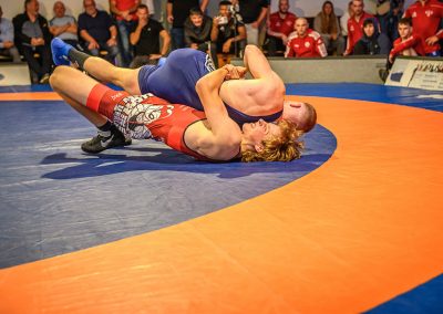Abschließend kam es zum letzten Kampf zwischen Jan Hiebsch und Jean Francois Hild. Der junge Urloffener fand zunächst schwer in das Kampfgeschehen und lag schnell mit 6:0 Punkten zurück. Davon ließ er sich aber nicht beirren und konterte mit einer Viererwertung. Er brachte seinen Gegner in die gefährliche Lage, aus der er sich befreien konnte, jedoch dabei einige Körner ließ. Anschließend sicherte sich Hild mit einem Kopfhüftschwung eine Viererwertung, doch Hiebsch konnte Ihn übertragen und im Gegenzug weitere Punkte im Boden sammeln. Mit einem Halbnelson setzte er anschließend Hild auf beide Schultern und avancierte zum Matchwinner. (17:14)