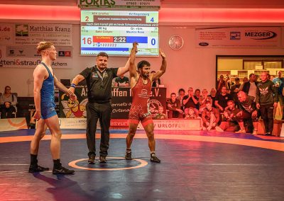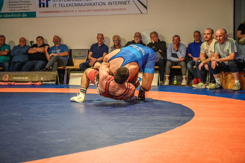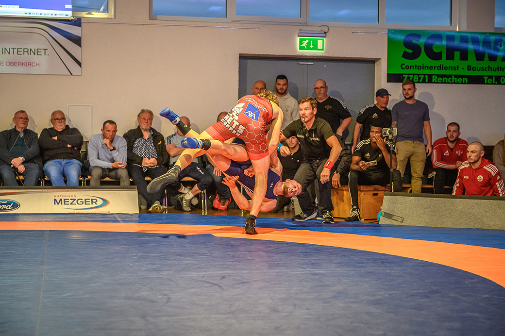 75 kg (griech.-röm.): Einen weiteren Punktegaranten haben die Hornets mit Nika Korshia in ihren Reihen. Auch er konnte gegen den überforderten Max Kohl aus Riegelsberg die Fans durch sehrenswerte Wurftechniken begeistern. Bereits nach knapp drei Minuten stand der Überlegenheitssieg des Hornet fest. (16:7)