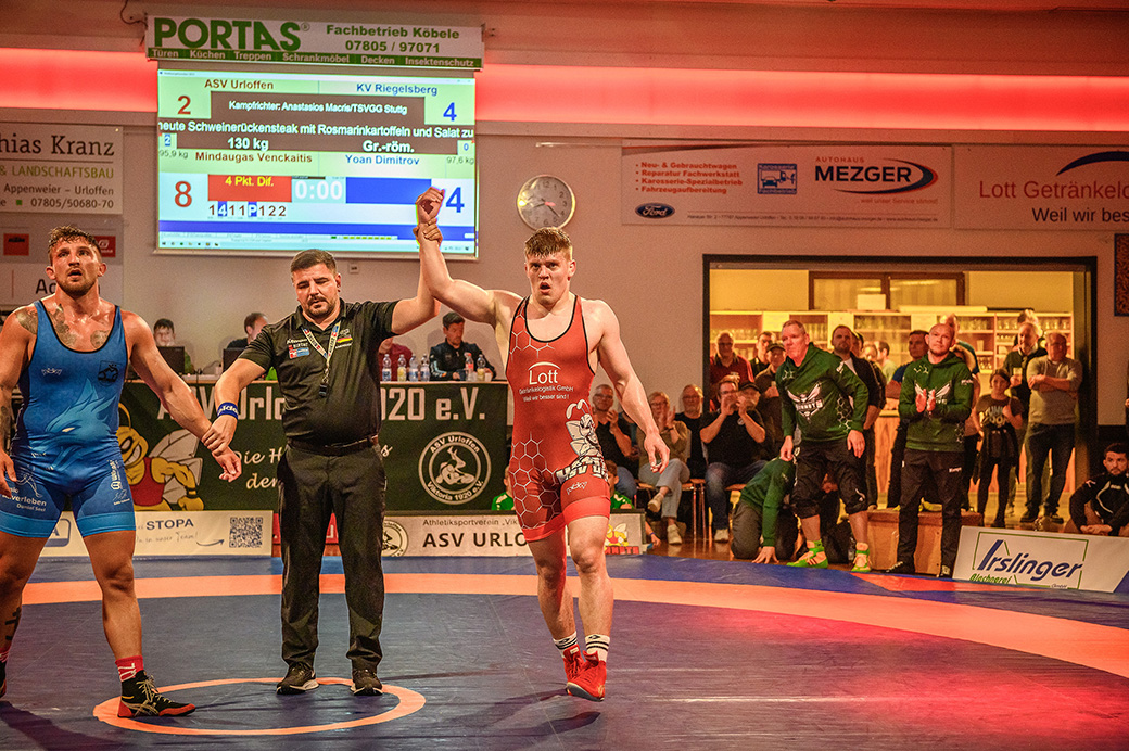 130 kg (griech.-röm.): Mit einer 1:0 Wertung ging Mindaugas Venckaitis für Urloffen in Führung, bevor der Bulgare Yoan Dimitrov im Dress des KV Riegelsberg durch einen überraschenden Wurf Mindaugas in eine gefährliche Lage brachte, aus der sich der Urloffener befreien konnte. Danach punktete nur noch der Urloffener, der keine weitere Wertung des Saarländers mehr zuließ und den Kampf am Ende mit 8:4 für sich entscheiden konnte. Urloffen verkürzte damit auf 2:4.