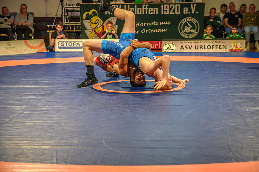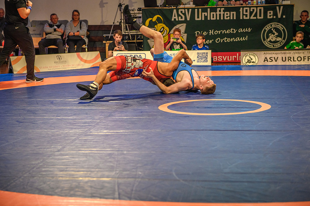 66 kg (Freistil) Einen spannenden Kampf sahen die Zuschauer zwischen Ihnat Dishli und Salikh Moussaiev. Früh konnte der Urloffener den Elsässer mit einem Achselwurf überraschen und ging früh in Führung. Auch danach suchte Dishli immer wieder den Angriff. Doch Moussaiev konnte dem Druck standhalten. Nach der Pause drehte der Gast das Tempo auf, nutzte jede kleine Unachtsamkeit und konnte den bisherigen Kampfverlauf auf den Kopf stellen. Am Ende gab es eine bittere 9:16 Punktniederlage für den jungen Urloffener. (9:4)