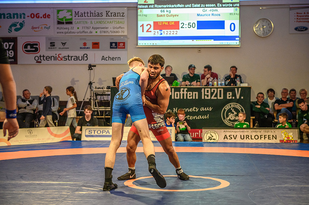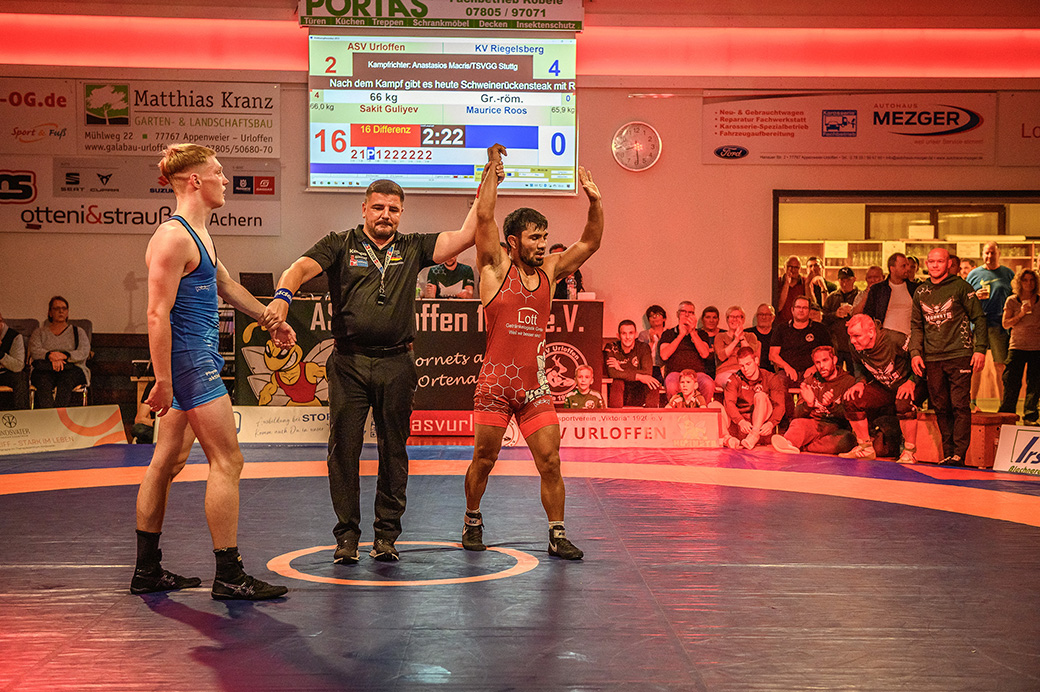 61 kg (griech.-röm.): Mit Sakit Guliyev haben die Hornets hier einen exzellenten Griffkünstler in ihren Reihen. Dies musste auch sein Gegner Maurice Roos feststellen. Nach knapp 4 Minuten stand der Überlegenheitssieg fest. Mit 6:4 ging die Führung im Mannschaftskampf erstmalig an Urloffen.