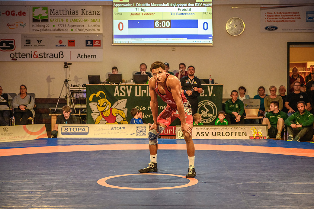 71 kg (Freistil): Mit Justin Federer schickte Urloffen den amtierenden Deutschen Meister (U20) auf die Matte. Gewohnt konzentriert setzte er gegen Tim Butterbach seine Angriffe und konnte so nach Ablauf der Kampfzeit weitere zwei Mannschaftspunkte für Urloffen erkämpfen. Mit einer knappen 8:7 Führung gingen die Hornets damit in die Pause. Diese Führung sollten sie nicht mehr abgeben.
