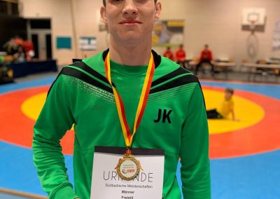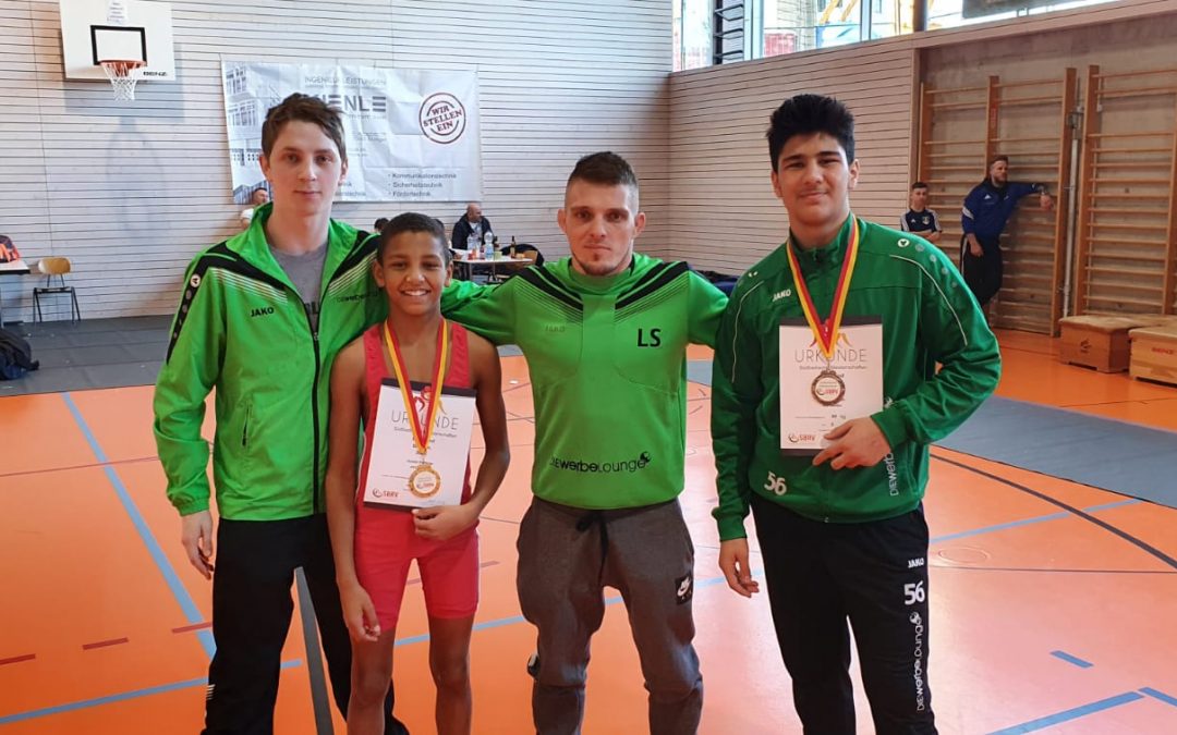 Joshua Knosp startete in der Klasse bis 70 kg. Er marschierte förmlich durchs Turnier und errang souverän, ohne selbst eine technische Wertung abzugeben, den ersten Platz. Justin Federer hatte in der Klasse bis 38 kg keinen Gegner und wurde kampflos Südbadischer Meister. Federer durfte in der Klasse bis 41 kg außer Konkurrenz mitringen und zeigte dort seine Stärke. Er konnte alle drei schwereren Jungs besiegen und verdiente sich somit den Südbadischen Meistertitel.