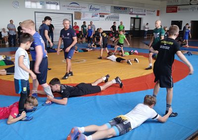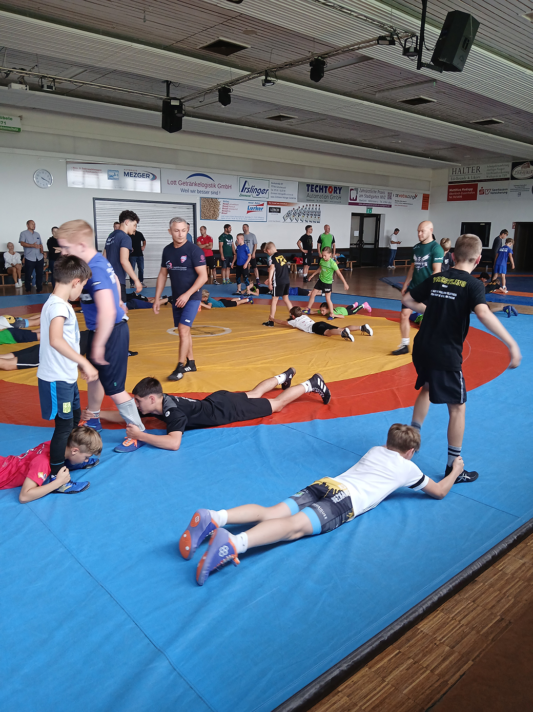 Nach einem lockeren Auslaufen ging es in die Mittagspause, in der die jungen Ringer mit viel frischem Obst neue Energie tanken konnten. Am Nachmittag folgte ein weiteres gemeinsames Aufwärmen, gefolgt von einem leichten Einringen mit Trainingspartnern. Den Abschluss bildeten zahlreiche Trainingskämpfe, bei denen das Erlernte direkt angewendet werden konnte.